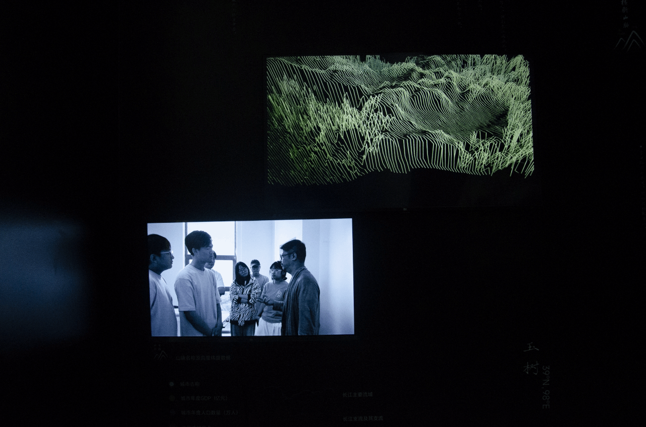 基于展厅客观因素,团队尝试打造左右墙面、棚顶与地面的呼应式叙事空间,挖掘场域的情感化因素,其目标为:1.信息可视化单元,左墙面。体现长江周边水文的多维度变化规律和潜在逻辑关系,反映周边城市的概况。