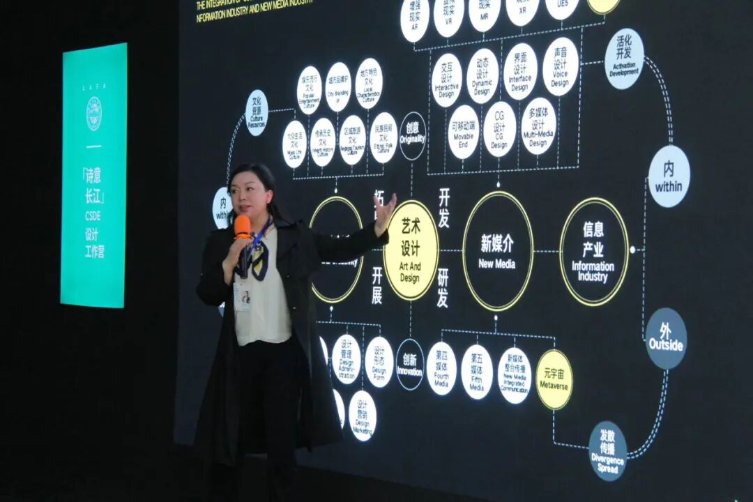 赵璐院长为工作营师生进行专题讲座走进“诗意长江”展区,仿佛置身于一个充满创意与激情的艺术空间。工作坊内,工作营师生们正忙碌地创作着各种以长江为主题的艺术作品。墙上挂着信息可视化的长江水文数据图表,右侧墙面则播放着长江的宏大叙事数字影像。展厅棚顶悬挂着机械装置艺术,模拟长江的动能与智性。地面上的沉浸式交互装置则引导观众进入数字化虚拟空间,感受长江水流域的真实意象,现场效果深受欢迎。