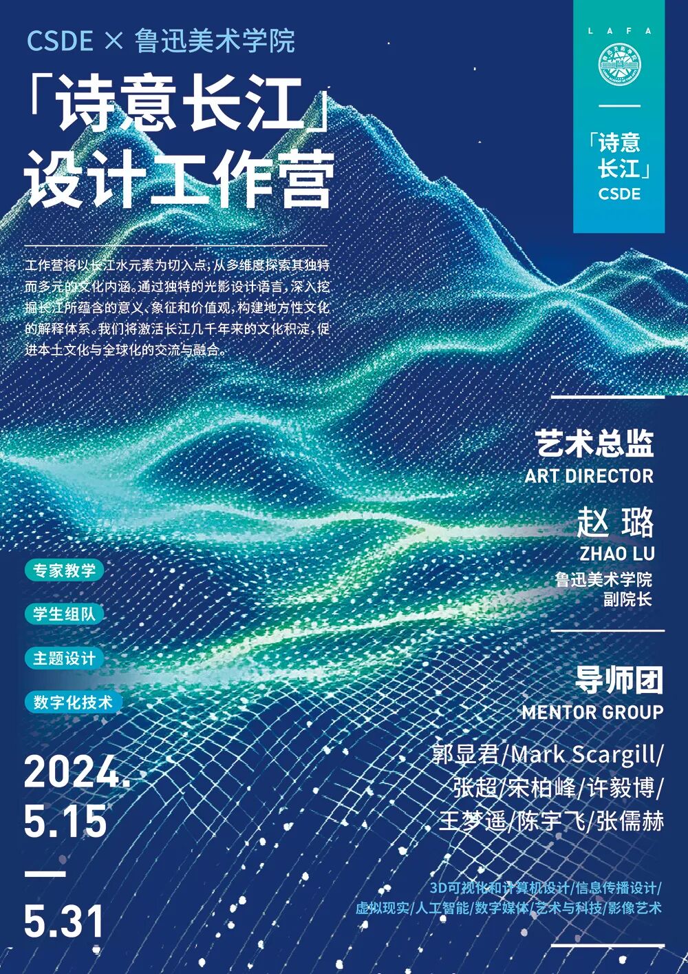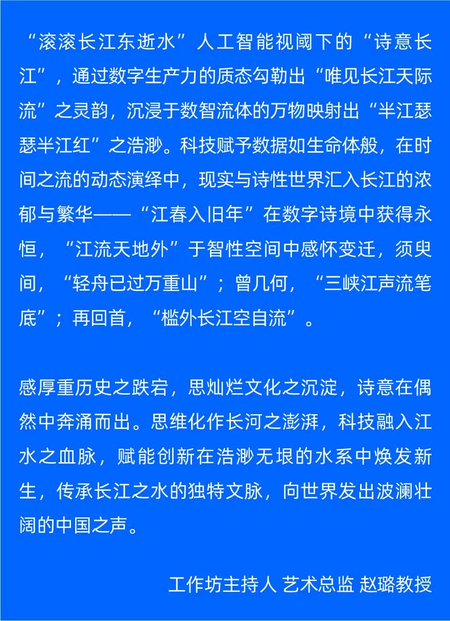 紫金奖·第五届中国(南京)大学生设计展推出以“我们的长江”为核心的长江主题工作营展,按照视觉、听觉、触觉、意境等不同感知形式,分别由清华大学、上海交通大学、南京大学、中央美术学院、鲁迅美术学院等高校领衔,每一个工作营聚焦一种数字时代感受长江的媒介途径,最终所有工作营共同构成一个多维度的感知长江的对话。自2024年5月20日,“诗意长江”设计工作营以创意为单位,在具有多种学科背景教师指导委员会的指导下,通过专家线上教学、团队共同设计、专家全程辅导、多元数字化技术进行创作实践等形式进行工作营课程。以赵璐院长为代表的导师团带领24名营员共议共创,从作品的初步构思到最终呈现,通过每一个设计细节展现长江水元素的魅力与深厚内涵。在“诗意长江”工作营的精心策划与师生们的共同努力下,大家致力于推动长江文化的传承与创新,期望让长江的诗意与魅力触及更广泛的受众。