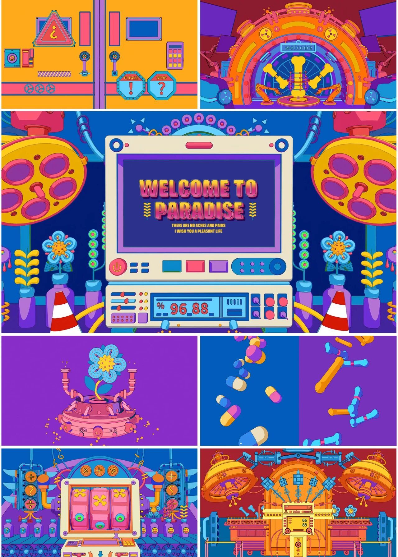 人被动的接受医疗器械的治疗,而这些器械是没有温度冰冷的,甚至很多器械植入人体器官之中,作品围绕医疗器械与人和谐共处提出思考,希望创建一个新的无痛苦世界,以医疗器械为原型,在这个“游戏厅”,所有的器械在保留原始特征的同时物化成游乐设施,例如呼吸机、手术灯、针管、核磁共振机等。希望来到这个世界的人没有痛苦、悲伤。极乐游戏厅无需研发创造,皆自然呈现出来,便是极乐。
