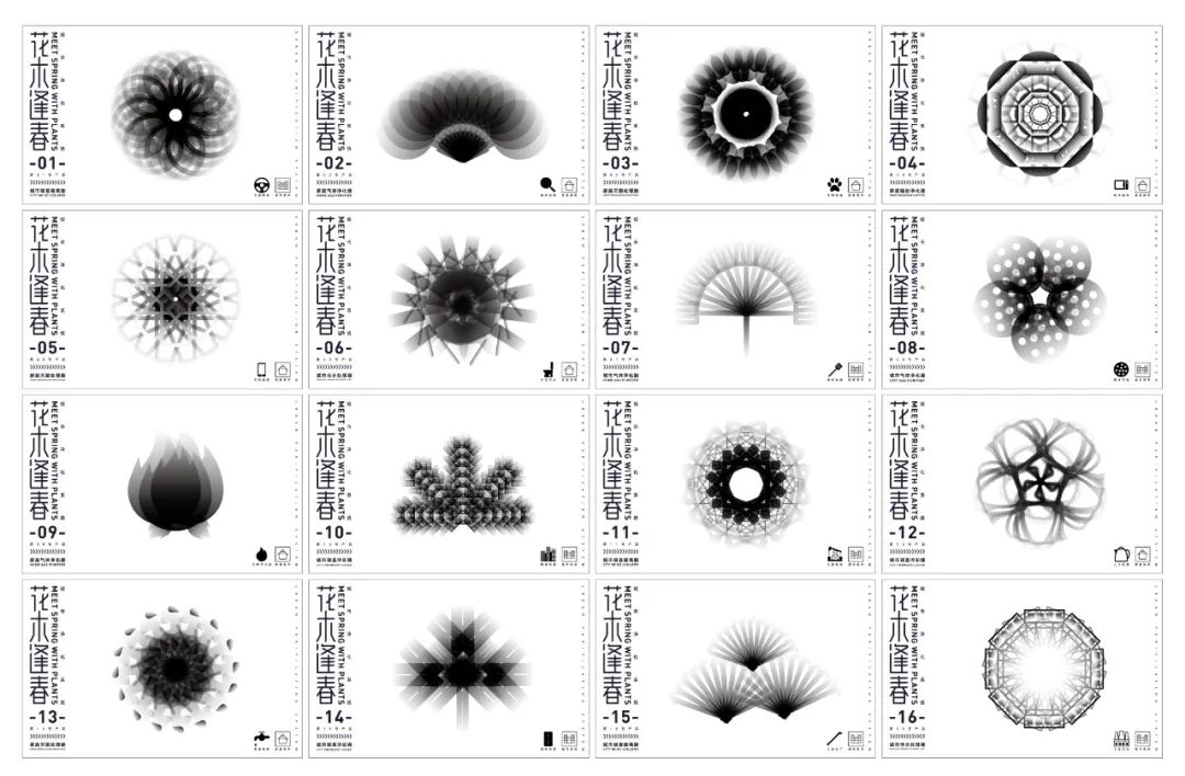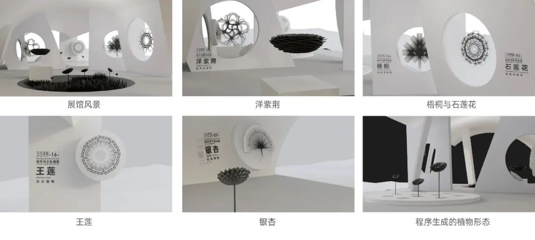 《花木逢春——城市净化系统》研究了城市中植物的抗污染作用。根据不同的植物净化的功能,将城市中产生污染的相关物品与植物形象相结合。以污染物为基础图案生成植物的形象,并赋予黑色调来表达植物对城市污染的吸纳作用。同时将植物元素再生成虚拟植物,搭建出虚拟的线上展览世界,使观览者可以进入其中进行交互游玩。