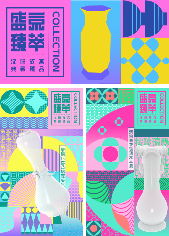 《盛京臻萃》是由沈阳故宫藏品为灵感创作的一系列视觉创意与动态化设计作品。我们提取了藏品中的纹样特征进行了几何化的抽象设计,在设计中采取了二维与三维结合的艺术手法,用当代的图形化设计语言来重译沈阳故宫藏品的艺术性,用艺术手法对藏品进行解构和重组,开拓与发展了传统纹样的创作形式,使纹样与现代多媒体技术进行结合,重新诠释了沈阳故宫藏品的文化内涵。该设计以沈阳故宫的院藏精品为设计原型,在宣传沈阳故宫文化历史的基础之上,紧跟现代化设计的潮流符合数字媒体技术的新发展,赋予这些臻品新时代的意义,宣传沈阳城市文化形象,推动富强美丽的辽宁建设与发展,有利于大力弘扬中国优秀传统文化,使大众更能够深入了解数字时代下传统文化的魅力。