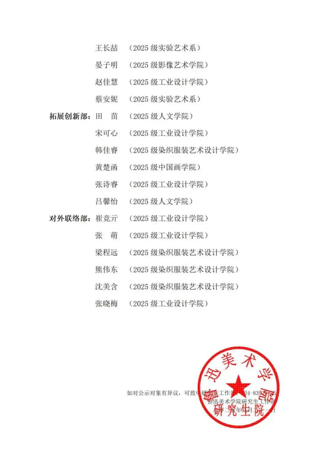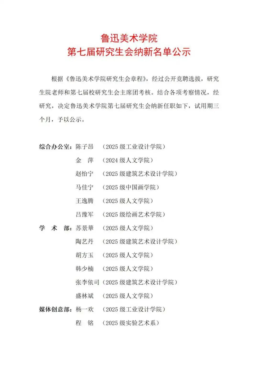 经研究,决定鲁迅美术学院第七届研究生会纳新名单如下,试用期三个月,予以公示。
