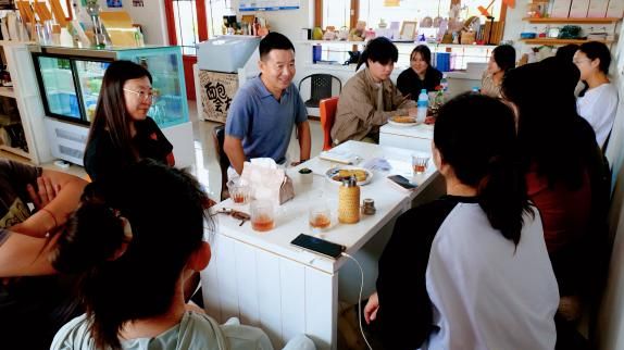 7月8日下午,践行团成员来到民俗园区,走进返乡创业者万长忠的“昕焙云朵”店铺。在这场“村庄遇见艺术生”的交流中,传统工艺与现代创意撞出了火花——他谈创业经验,他们聊工艺融合;他展示非遗技法,他们分享设计包装与品牌理念。