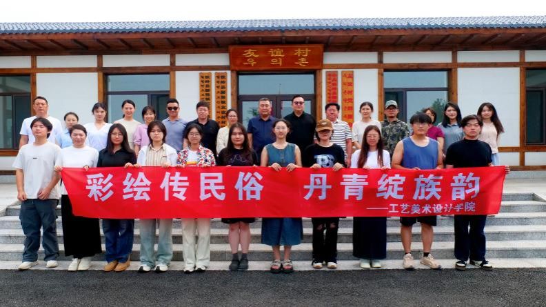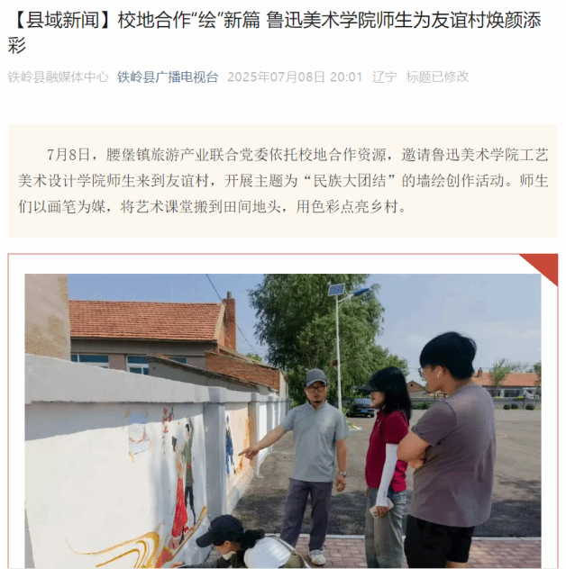 2025年7月5日至11日,我校工艺美术设计学院“彩绘传民俗 丹青绽族韵”社会服务践行团走进辽宁省铁岭市铁岭县腰堡镇友谊村,开展以“民族共融 艺术赋能”为主题的墙画创作与文创实践活动,让艺术之美浸润乡村空间,用设计语言讲述民族团结的时代故事。