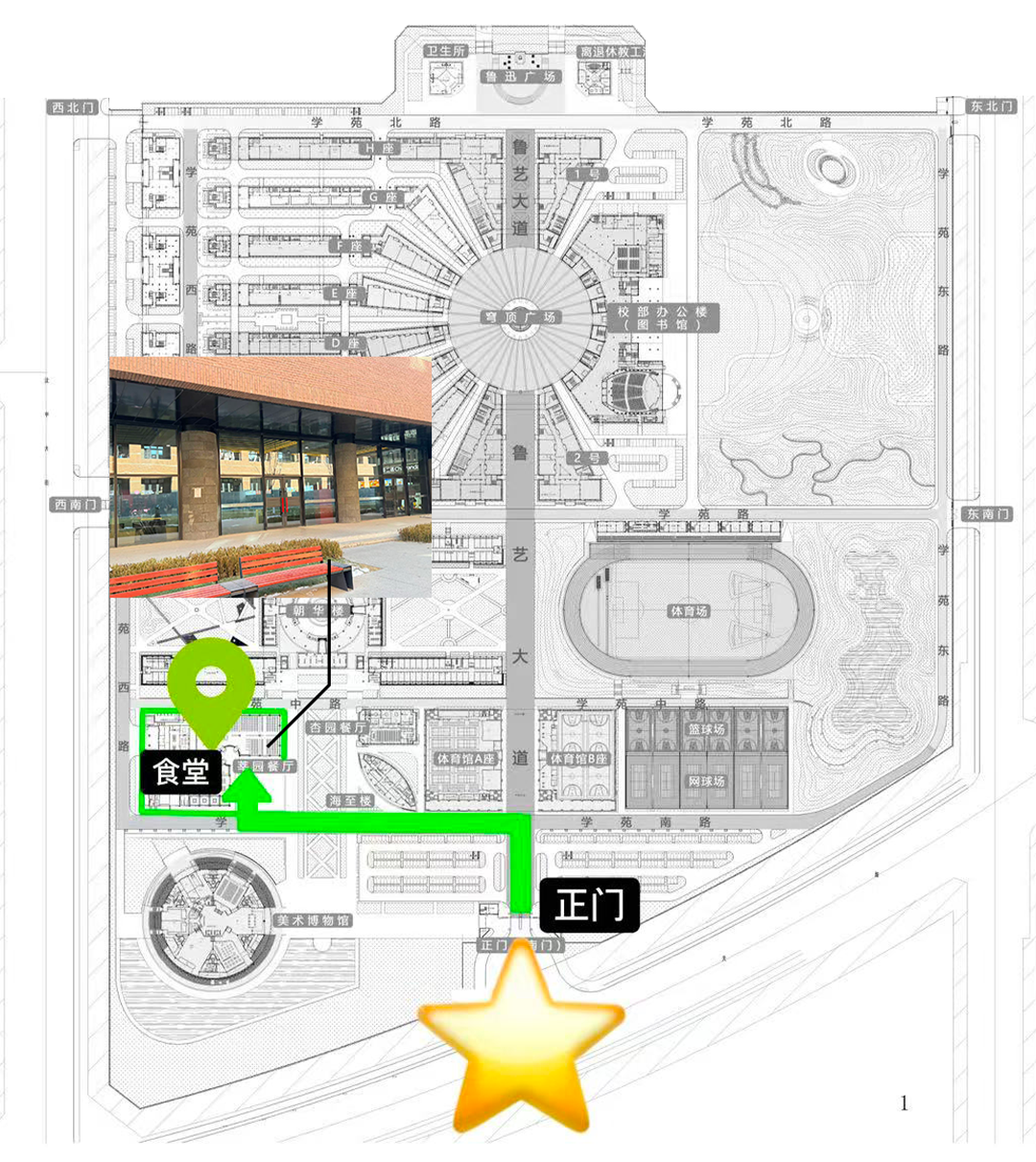 位置:校内设有学生食堂,靠近宿舍楼。从正门进入后左转,看到美术馆(圆形楼)后右转进入第一个楼即是食堂。