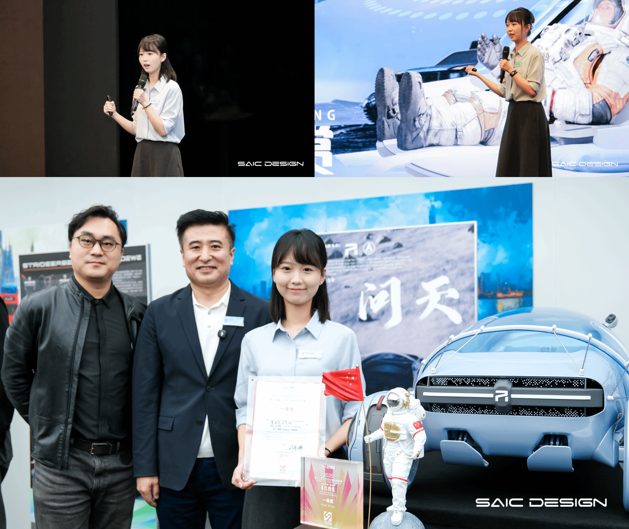 自第十三届上汽设计国际挑战赛任务书发布以来,顾汐饶在导师丁剑副教授的悉心指导下,顺利跻身大赛100强。而后,经评委团严格评审,她成功入选中国赛区27强,并获得上汽设计中心的实习机会。在近两个月的实习实践中,她不断对作品进行深化迭代。其作品《问天》成功获得上汽的高质量模型赞助,凭借优质的设计效果和精彩的汇报路演,最终在决赛中摘得总冠军。