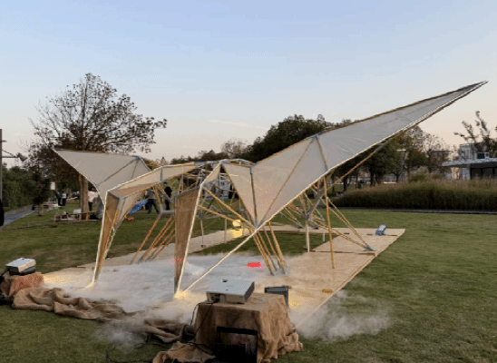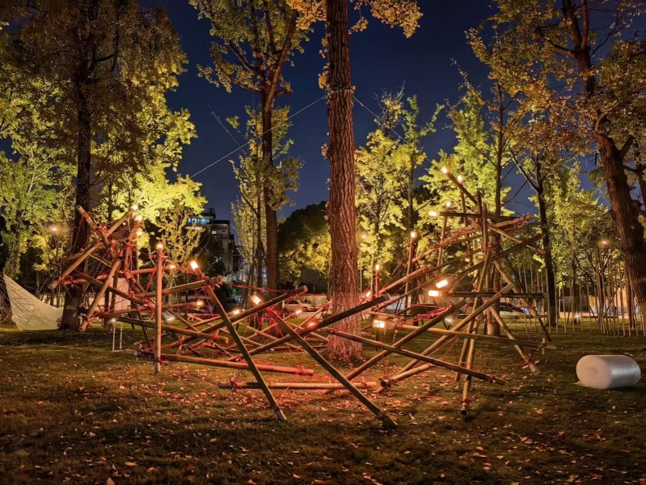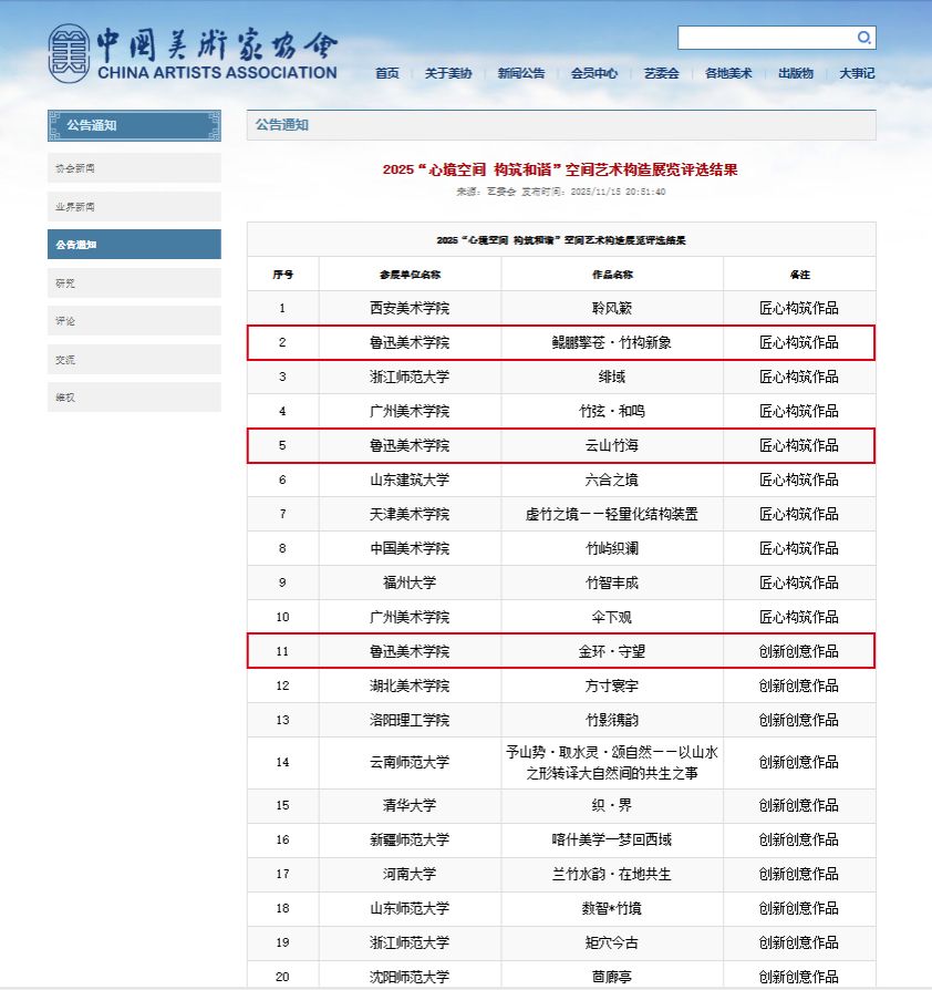 展览中,我校建筑艺术设计学院的3组作品从140件投稿作品中脱颖而出,经现场搭建、现场评选,同其他55所学校作品同场角逐。最终,作品《鲲鹏擎苍·竹构新象》与作品《云山竹海》获得最高荣誉——“匠心构筑作品”,作品《金环·守望》获得“创新创意作品”的优异成绩。