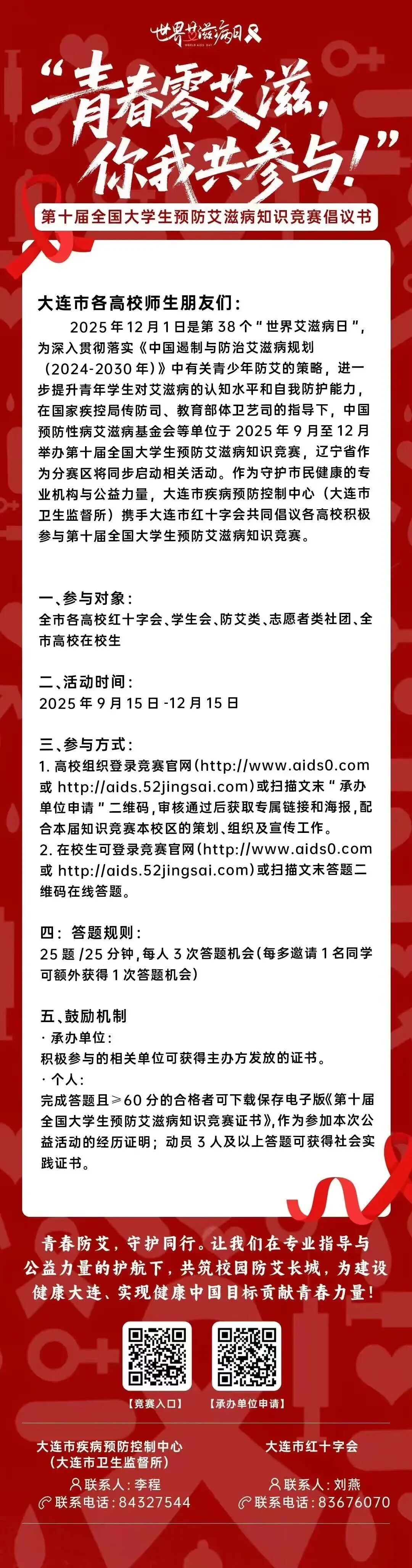 2025年12月1日是第38个“世界艾滋病日”,为响应“社会共治,守正创新,终结艾滋”主题号召,进一步提升全校师生对艾滋病的科学认知,强化自我防护能力,弘扬健康平等理念,营造包容友善的校园氛围,鲁迅美术学院大连校区党委学生工作部、一站式学生社区卫生所特举办“知艾防艾,健康同行”主题系列宣传活动,以青春之力筑牢校园健康防线。