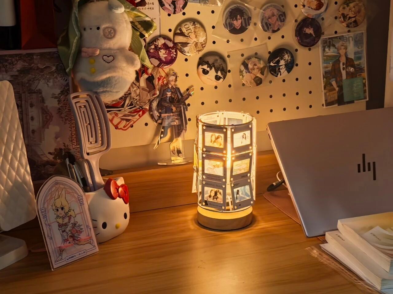 将大家准备的照片打印成反转片,放进卡框里固定,然后根据灯架顶部间距打孔,最后穿环悬挂即可获得一盏反转胶片灯。