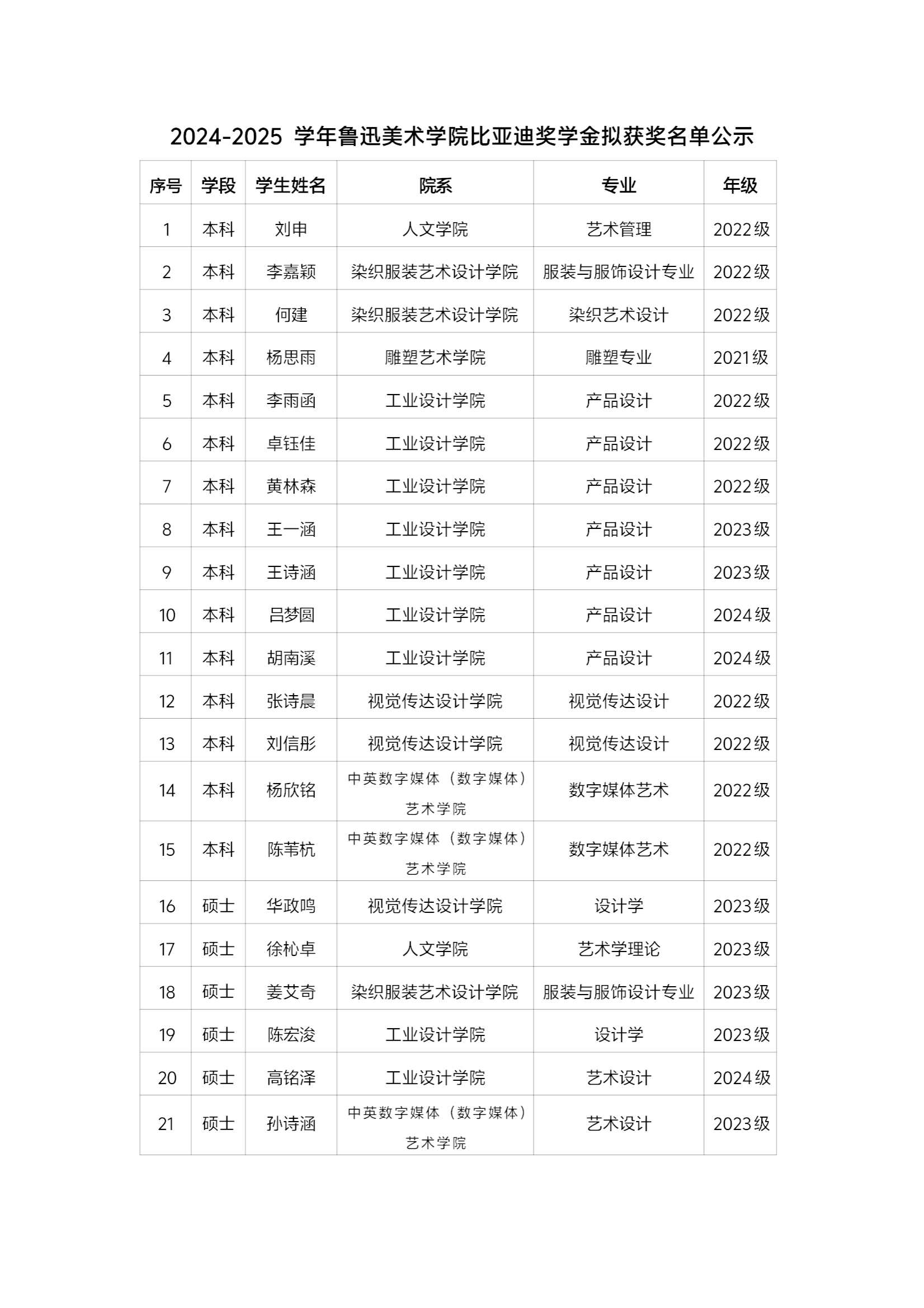现将 2024-2025 学年鲁迅美术学院比亚迪奖学金拟获奖学生名单予以公示,公示发布后,对上述拟获奖人选如有不同意见,请于 2025 年 12 月 23 日下班前以电话、信函、亲访等方式向学生工作处学生资助管理中心反映,反映问题应署真实姓名。