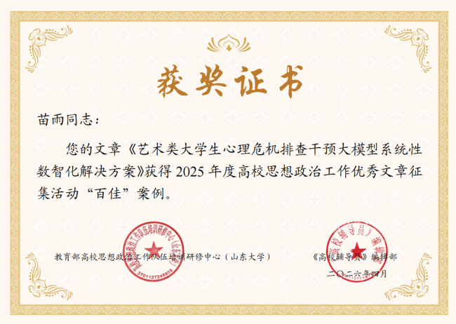 近日,我校党委学生工作部心理健康教育指导中心苗雨老师报送的工作案例《艺术类大学生心理危机排查干预大模型系统性数智化解决方案》获评由教育部高校思想政治工作队伍培训研修中心、《高校辅导员》编辑部联合主办的“2025年高校思想政治工作优秀文章征集活动”“百佳案例”奖。