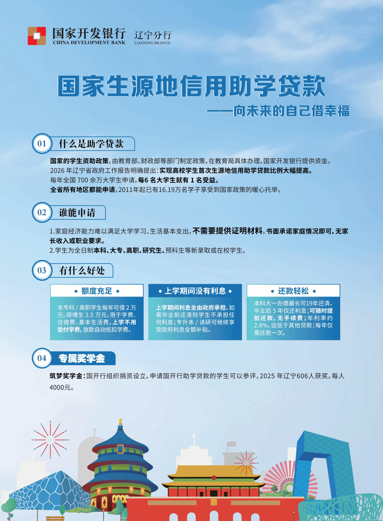 国家生源地信用助学贷款是一项由政府主导,银行、教育行政部门与高校共同操作的国家专项惠民贷款。每年全国700余万大学生申请,平均每6名大学生就有1名受益。无需担保或抵押,手续简便,还款方式灵活。学生与家长(或其他法定监护人)作为共同借款人,共同承担还款责任。