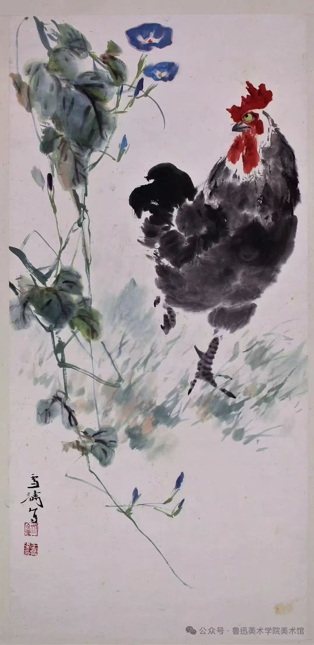 此幅作品绘公鸡牵牛花。画家运用酣畅淋漓的笔墨语言,通过浓淡相宜的墨色变化,将公鸡蓬松润泽的羽毛质感表现得淋漓尽致。画中雄鸡呈疾步奔走之态,回首凝望的姿势与牵牛花巧妙呼应。牵牛花以墨为骨、色为肉,叶片在墨色交融间尽显生机,两朵湛蓝的花苞傲立枝头,与雄鸡的动势构成和谐的视觉韵律。整幅作品在写意与传神之间达到完美平衡,既有文人画的笔墨情趣,又洋溢着浓郁的生活气息。