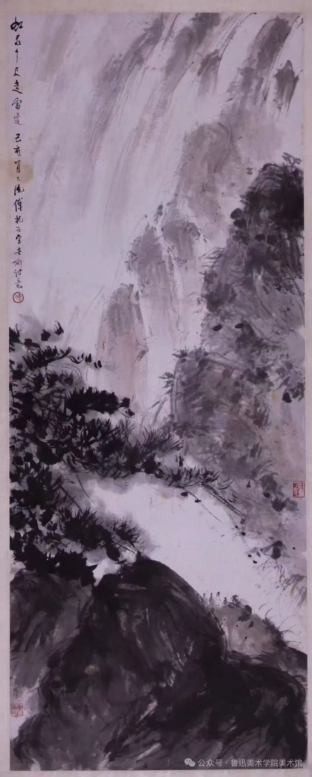 “烟云一见又商量”出自傅抱石的一幅山水画之题,轻描淡写之间极其真切地表达了画家对于山水创作的感悟,令人深有同感。傅抱石艺术创作以山水画成就最大,其擅作泉瀑雨雾之景多与“烟云一见”相关,但其“又商量”的结果却与各家不同,与自己的各个时期也不尽相同。此幅水墨淡彩绘飞瀑、山石、流泉,有其典型的“抱石皴”画法。画面截取飞瀑湍急的中景作为最上端,具有一种水从天上来的气势,水流急速而下,遇石则激起水花飞溅,正如其所自题“虹飞千尺走雷霆”,画家走笔线条劲健,笔意纵放飘逸,散峰乱笔之间乱中有序,深浅有致;三五古人立山观景,如临水边,尺寸之形却深得高古、传神之妙。作品沉雄浑厚、苍莽淋漓,体现了“抱石皴”的用笔特征,是其艺术成熟期的作品。