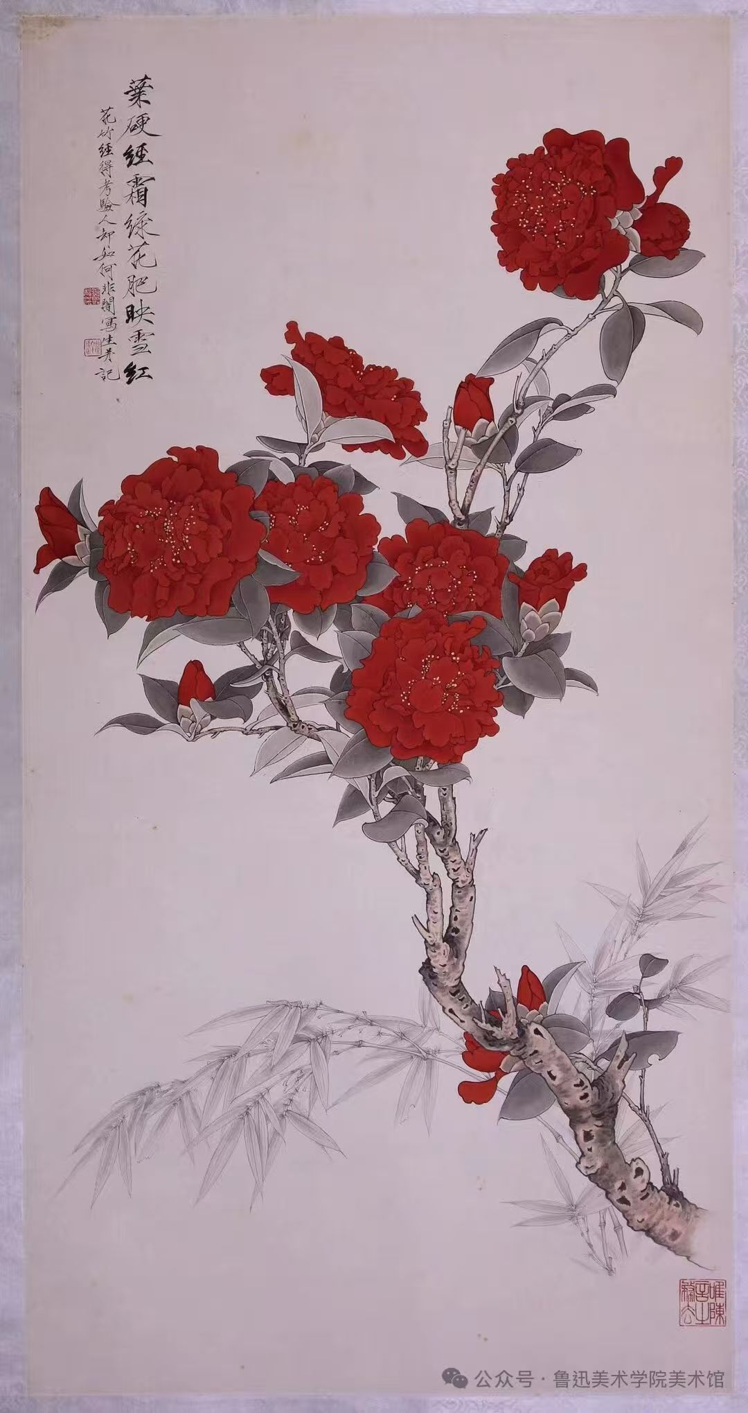 此幅重彩绘一树茶花。一枝老干倚斜而上,浓艳山茶随枝开放,附有散竹寥寥而依。茶花用浓墨勾线,转折勾勒间花瓣翻卷婀娜多姿,花色薄涂多染质感绒厚,藤黄点蕊俏丽活脱,数朵茶花映雪绽放韵态高贵。叶用墨色,筋脉挺健舒展,翻转向背层次自然。整幅画随类赋彩,色不碍墨、墨不碍色,“红花墨叶”丽而不俗。勾线以骨法用笔,线条柔中带刚,缓重疾徐极显功力。于非闇先生以线立骨,将茶花饱满、张扬、不屈的生命力尽现于纸上,工而不滞,重而不闷,花之神韵,枝之质势,叶之形态,栩栩如生绮丽挺拔。瘦金书题“叶硬经霜绿花肥映雪红”写出了对花骨、人格、画品的精辟感悟,诗、书、画、印互为映衬气骨不凡。