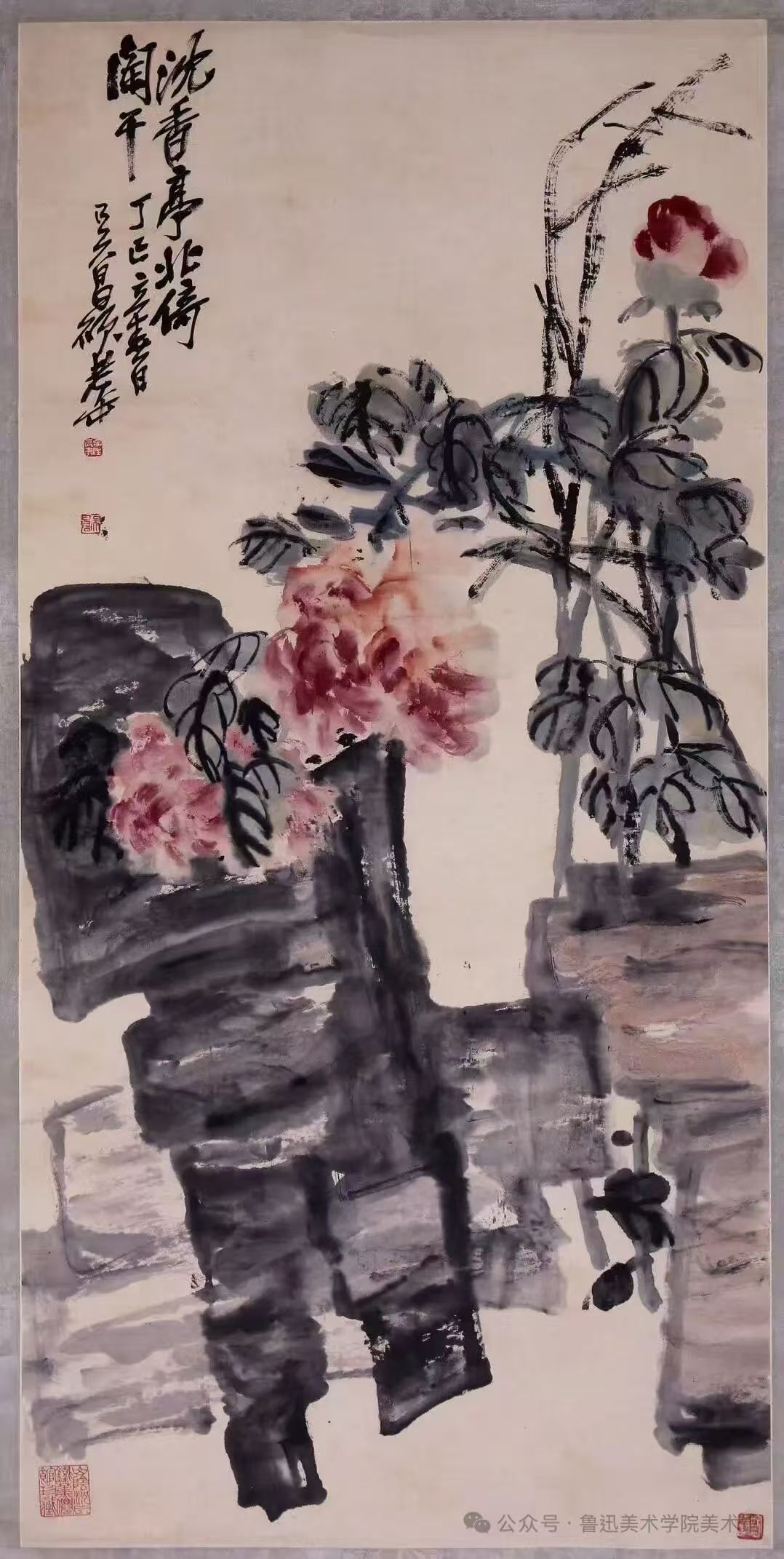此幅大写意绘牡丹,而顽石于画面中占据主体地位,反客为主,以衬牡丹之雅。画面中奇石横置,以石鼓文的结体与笔势作画,气势雄强,充满层次感和厚重感。牡丹象征富贵,用色简淡却丰富,浓艳却脱俗,丰腴轻透,不落脂粉之气。枝干以篆籀入画,下笔沉稳,线条千变万化,高级耐看,内涵丰富。左上留白处行书题跋“沈香亭北倚阑干”(沈同沉),此诗句出自唐代李白《清平调》中“解释春风无限恨,沉香亭北倚阑干”,描绘了牡丹花美丽动人的姿色,让人将烦恼消释而去,花在阑外,优雅风流。