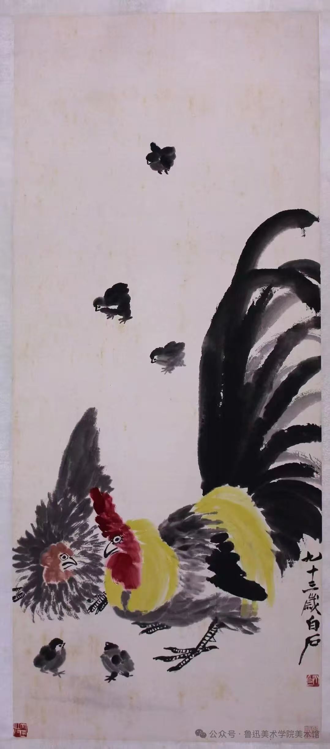 作品中五只鸡雏围绕在双亲身边觅食玩耍,温馨和谐,其情融融。齐白石在章法布局及笔墨掌控上尽显功力,雌雄二鸡姿态舒展,五只鸡雏聚散有致,用笔古朴、稚拙且有力透纸背之感,其篆隶之笔展现无余。