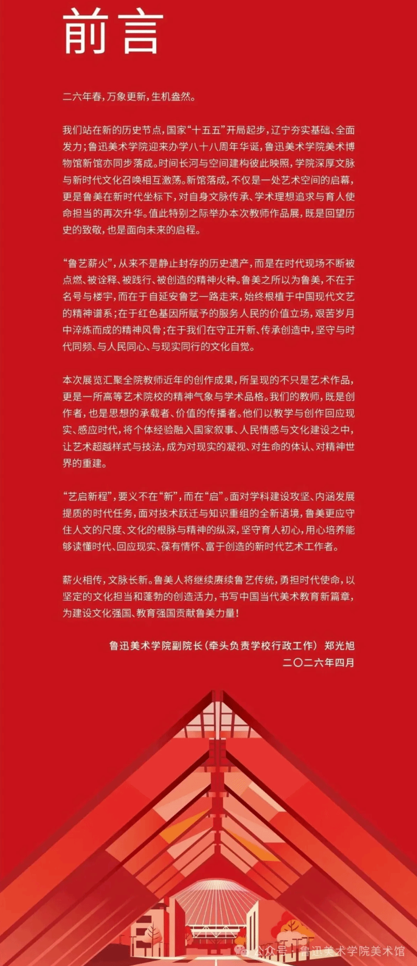 鲁艺薪火相传,美育新程启航。美术博物馆的启幕,是学校彰显办学底蕴、丰富校园文化生态的重要举措,春季教师作品展更将集中呈现鲁艺教师的创作实力与艺术思考。