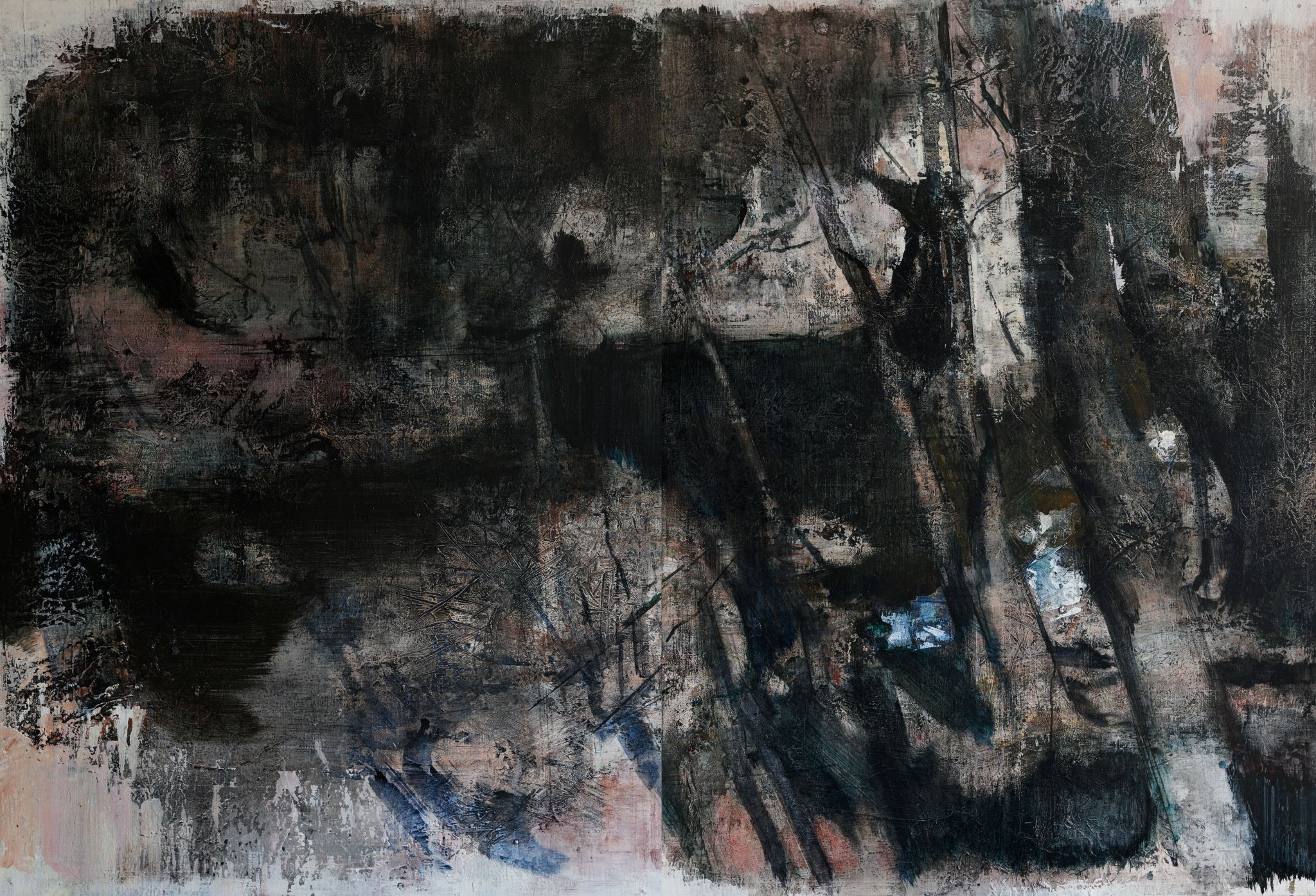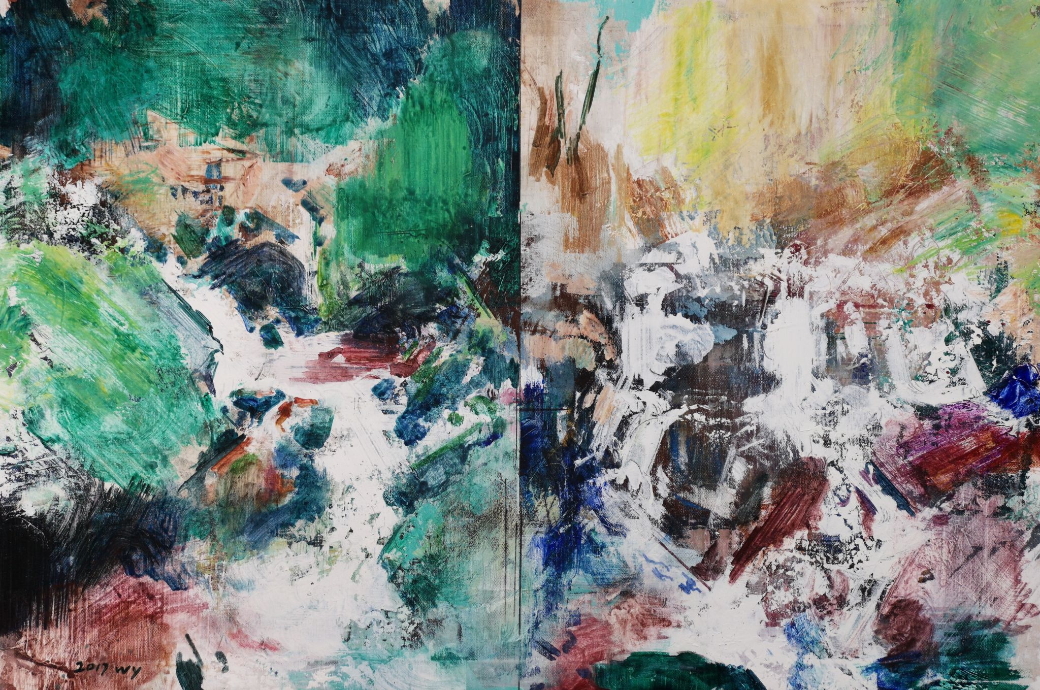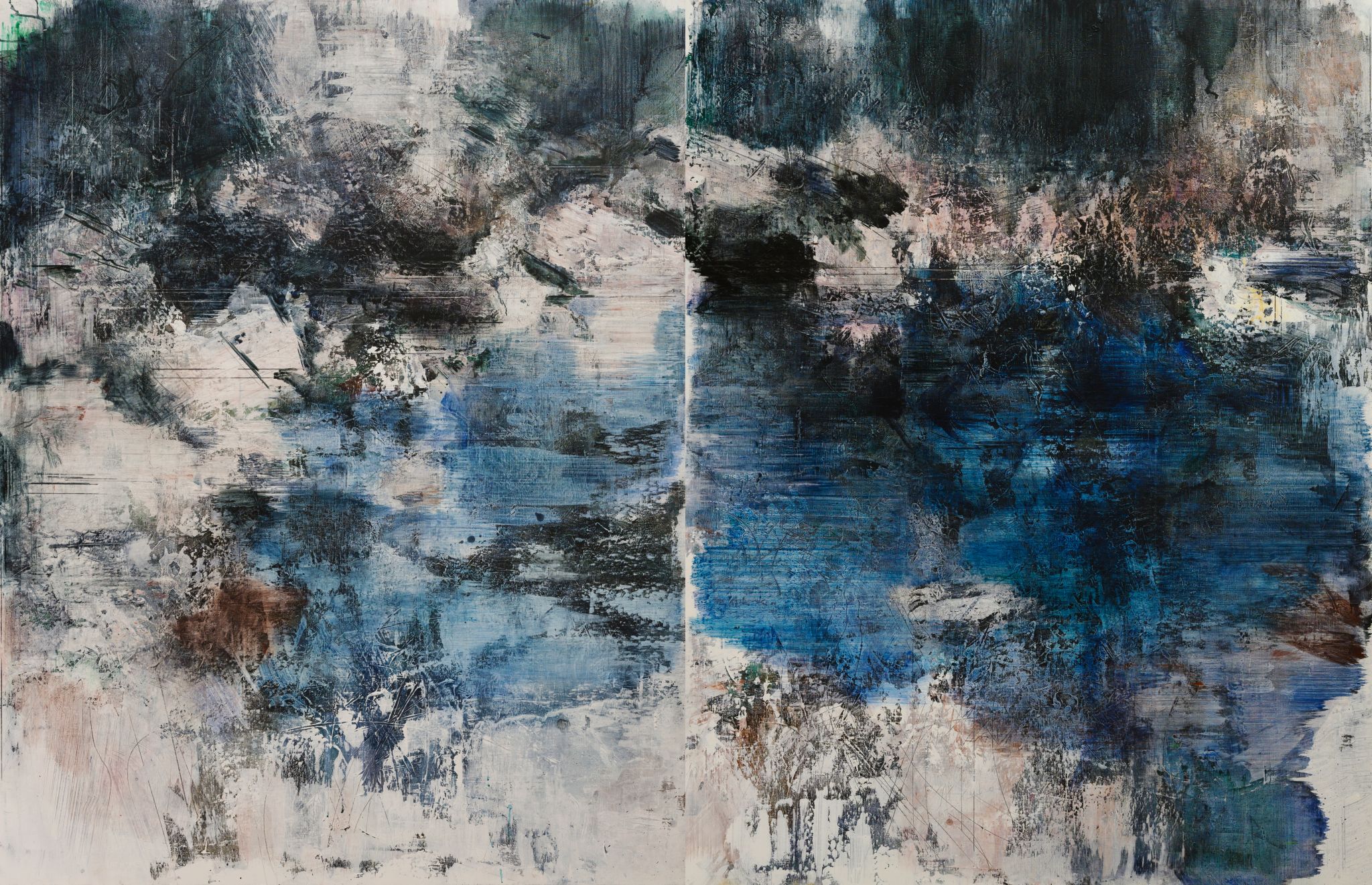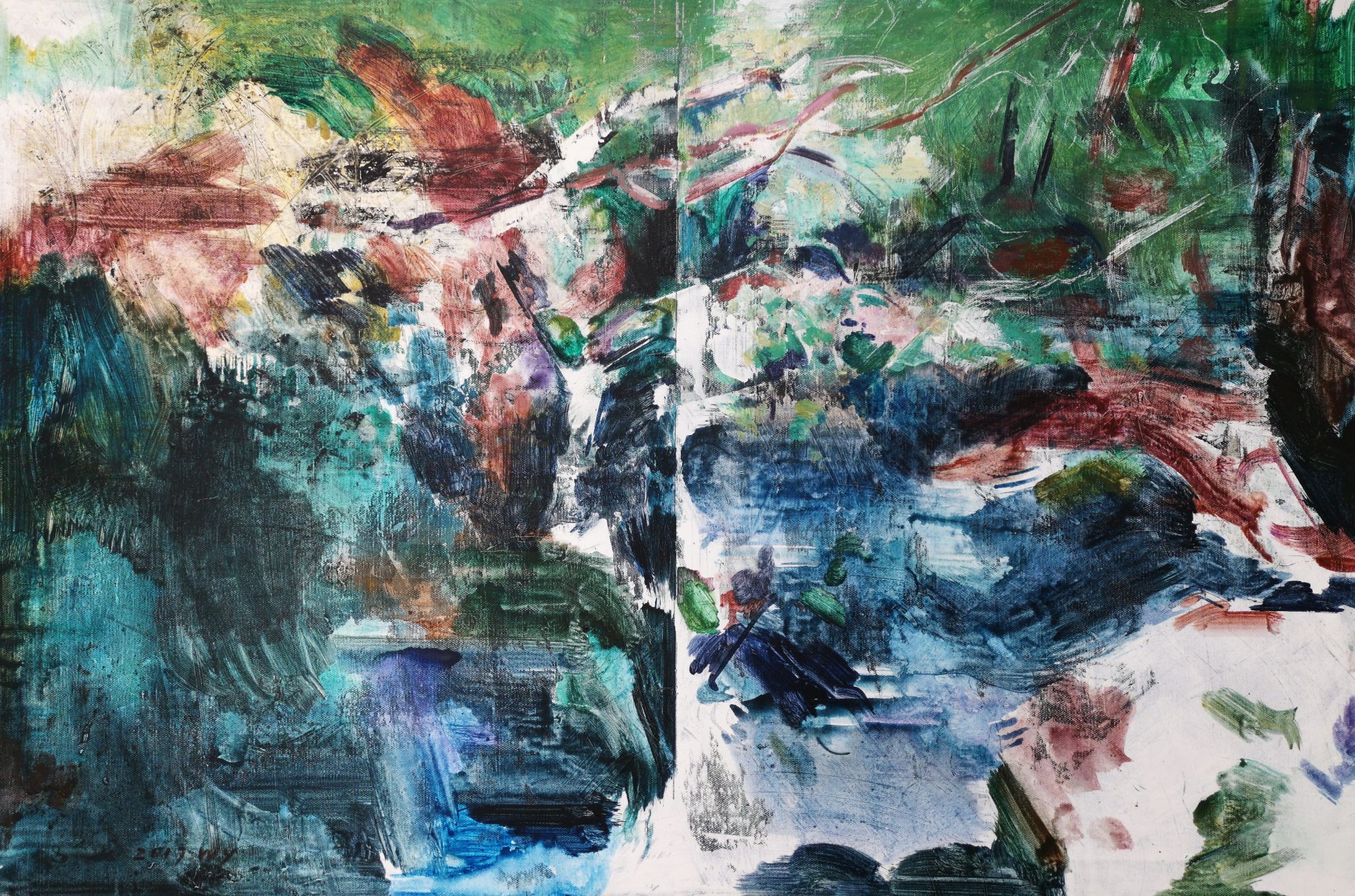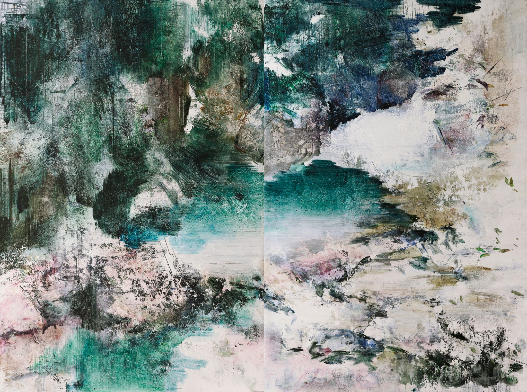 王:绘画活动永远和人的个体相关,人简单它就简单,人复杂它就复杂。所说“画如其人”讲的也是这个意思。从某种意义上说绘画活动也是人的现实存在方式和表现行为。从信仰层面和行为上说,我的绘画活动和状态更像是从现实的“抽离”和“出走”,精神的“持守”和灵魂的“安顿”。走入画室才能真正成为自己。回到自我撑控的世界和感性空间,才能真正回到内心。也许几条线在画面上如何摆放?迹象的质感和味道如何调理?心绪真的能得以舒解和释放。沉浸其间,享受绘画的欢愉,除此之外其它都不存在了,也变得不那么重要了。到了这个年纪,繁华靡丽,过眼皆空。对我来说,绘画活动也是一种救赎,从中寻找生的力量和心的安宁。因此,在这个过程中,我越来越“随心所驭”和“自得其乐”了,绘画更像是满足于一个愿望和一种残存的习惯,成为生活的重要组成部分。生命中最好的存在状态是在画室里孤寂的劳作当中,是远离尘嚣,于林间、溪边、石上流连忘返的那些时刻。当然,选择清流、深渊以及树木、山石作为近期作品中的主要视觉元素,也是试图将儿时终断的记忆续接起来。有人说诗人或艺术家之所以与众不同,是因为他们的童年没有结束,童年的感知力还有很强的持久性。我认同这个说法。每次走进森林,赤脚踏进溪流就如同回到儿时的时光,山光、水色、林幽与鸟鸣会使心灵得到最大的慰藉和修复。我也许自觉或不自觉地借用绘画的方式为自己创建了一个清澈幽远的精神意义上的场所,流连忘返其间,在现实与画面之间虚构出某种隐逸的错觉,寻求一种内在的心里平衡。“苍浪之水清兮可以濯我缨,苍浪之水浊兮可以濯我足”,借此传达现实的感悟、内心的向往和历史的幽思。这是从精神层面上而言。