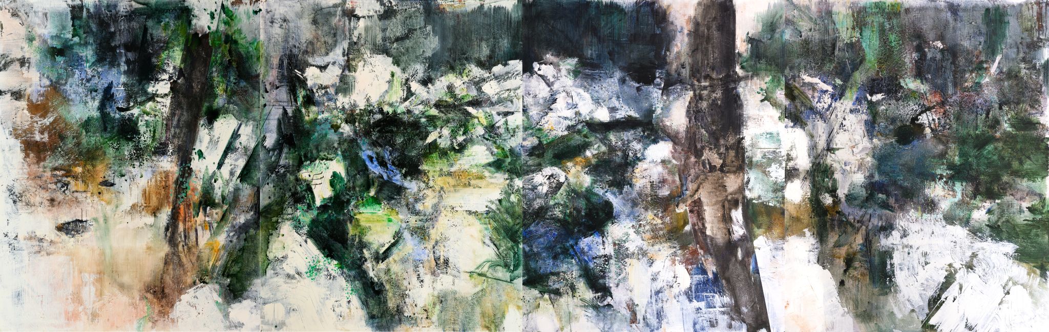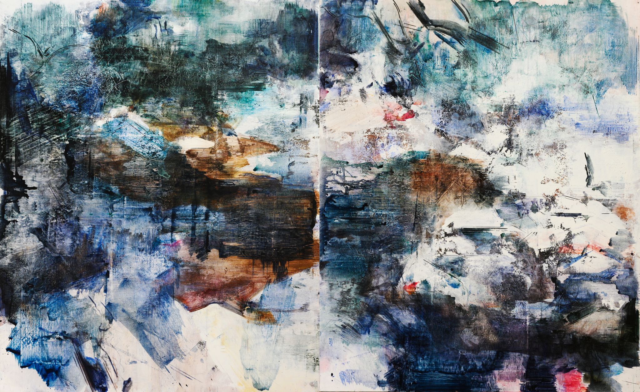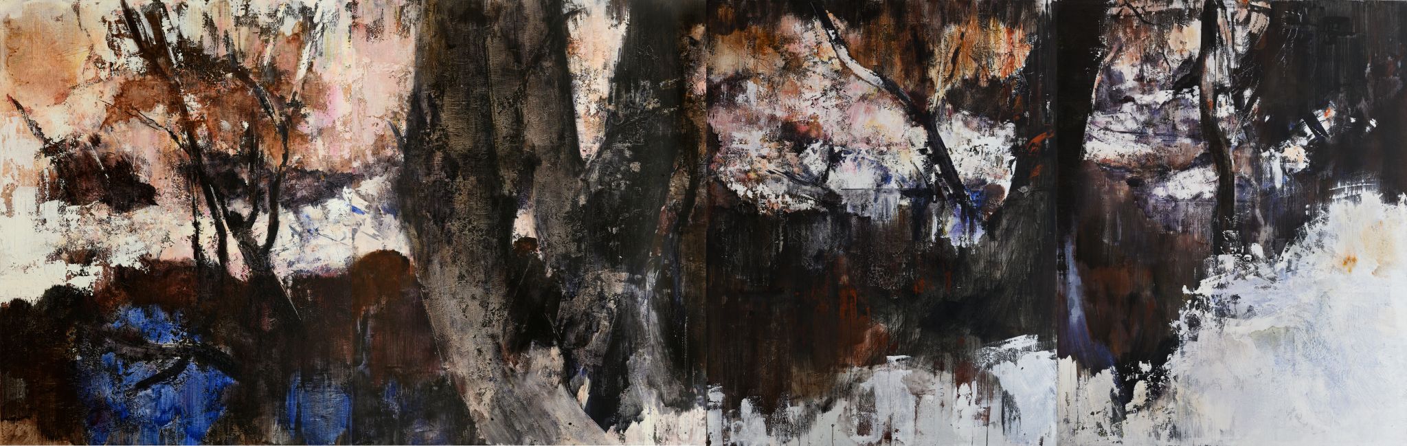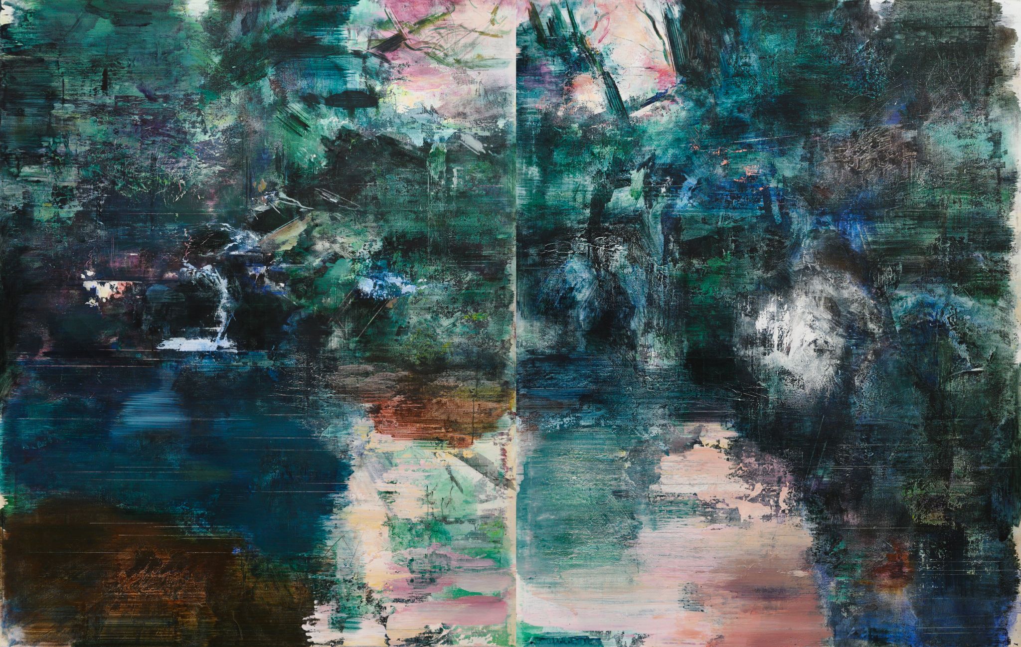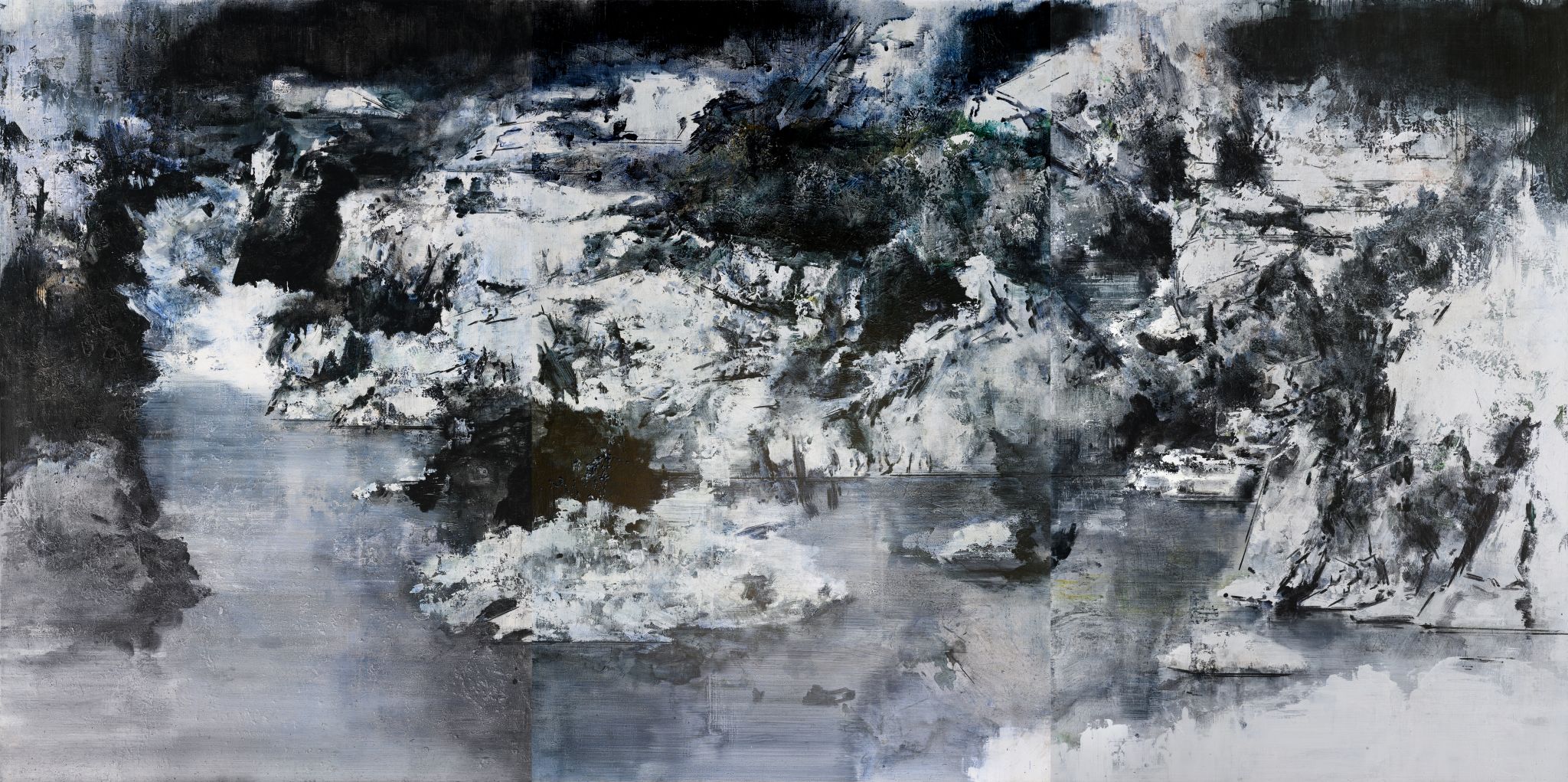 王:绘画活动永远和人的个体相关,人简单它就简单,人复杂它就复杂。所说“画如其人”讲的也是这个意思。从某种意义上说绘画活动也是人的现实存在方式和表现行为。从信仰层面和行为上说,我的绘画活动和状态更像是从现实的“抽离”和“出走”,精神的“持守”和灵魂的“安顿”。走入画室才能真正成为自己。回到自我撑控的世界和感性空间,才能真正回到内心。也许几条线在画面上如何摆放?迹象的质感和味道如何调理?心绪真的能得以舒解和释放。沉浸其间,享受绘画的欢愉,除此之外其它都不存在了,也变得不那么重要了。到了这个年纪,繁华靡丽,过眼皆空。对我来说,绘画活动也是一种救赎,从中寻找生的力量和心的安宁。因此,在这个过程中,我越来越“随心所驭”和“自得其乐”了,绘画更像是满足于一个愿望和一种残存的习惯,成为生活的重要组成部分。生命中最好的存在状态是在画室里孤寂的劳作当中,是远离尘嚣,于林间、溪边、石上流连忘返的那些时刻。当然,选择清流、深渊以及树木、山石作为近期作品中的主要视觉元素,也是试图将儿时终断的记忆续接起来。有人说诗人或艺术家之所以与众不同,是因为他们的童年没有结束,童年的感知力还有很强的持久性。我认同这个说法。每次走进森林,赤脚踏进溪流就如同回到儿时的时光,山光、水色、林幽与鸟鸣会使心灵得到最大的慰藉和修复。我也许自觉或不自觉地借用绘画的方式为自己创建了一个清澈幽远的精神意义上的场所,流连忘返其间,在现实与画面之间虚构出某种隐逸的错觉,寻求一种内在的心里平衡。“苍浪之水清兮可以濯我缨,苍浪之水浊兮可以濯我足”,借此传达现实的感悟、内心的向往和历史的幽思。这是从精神层面上而言。