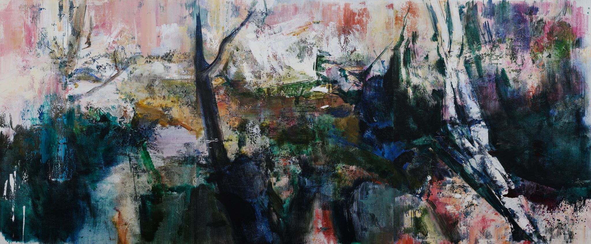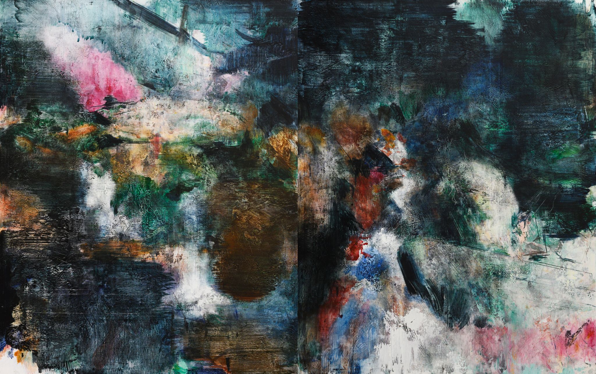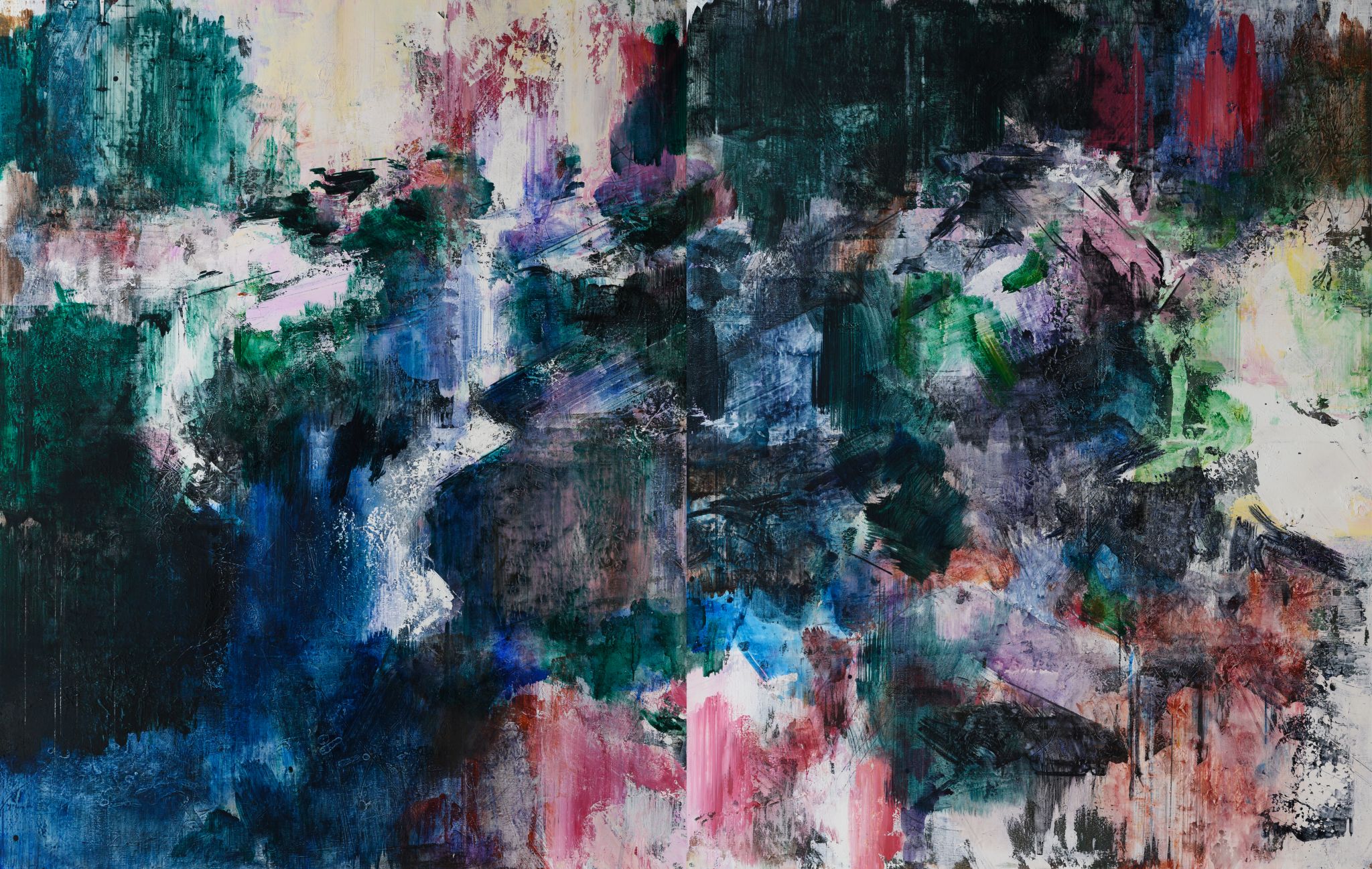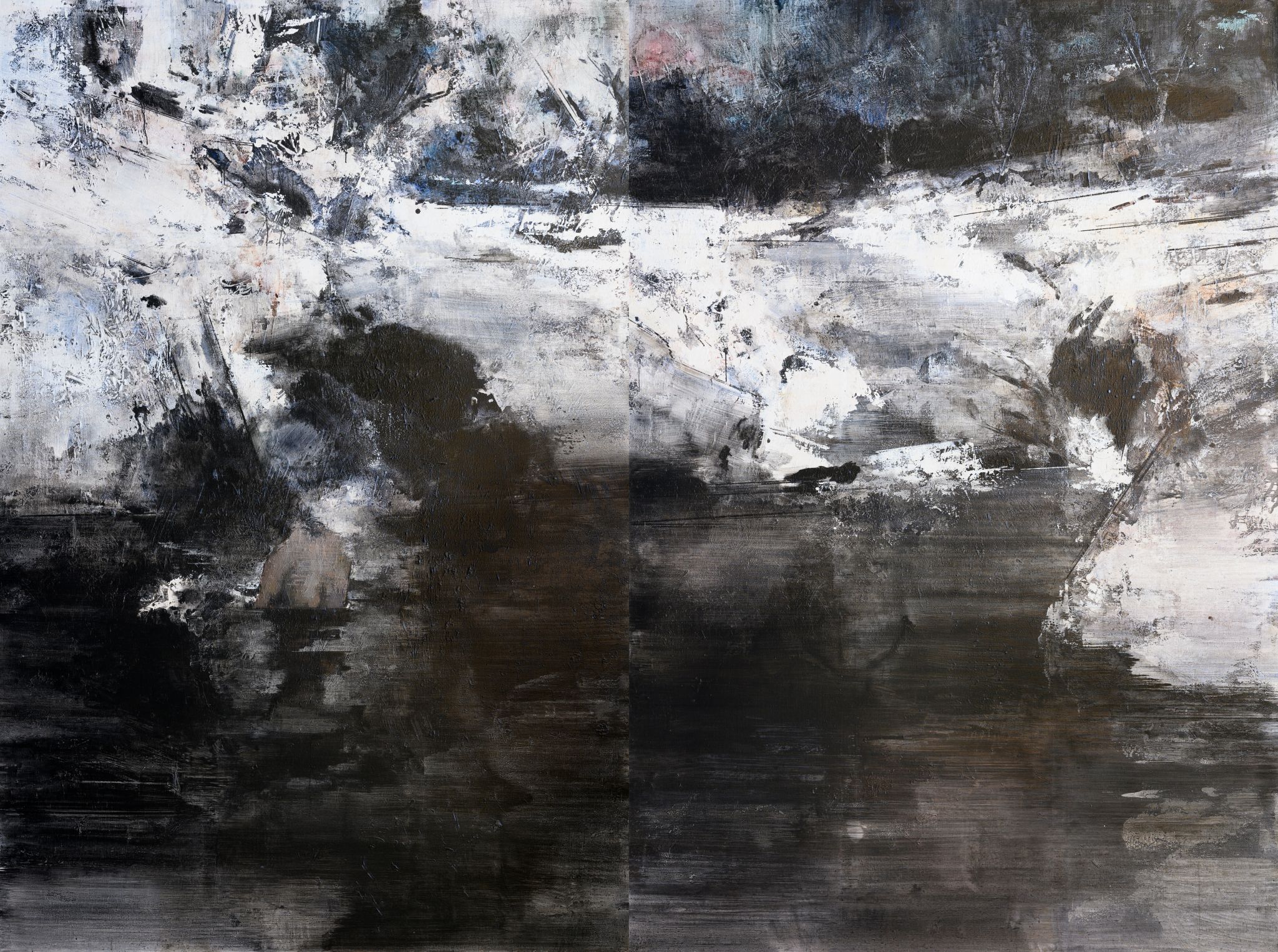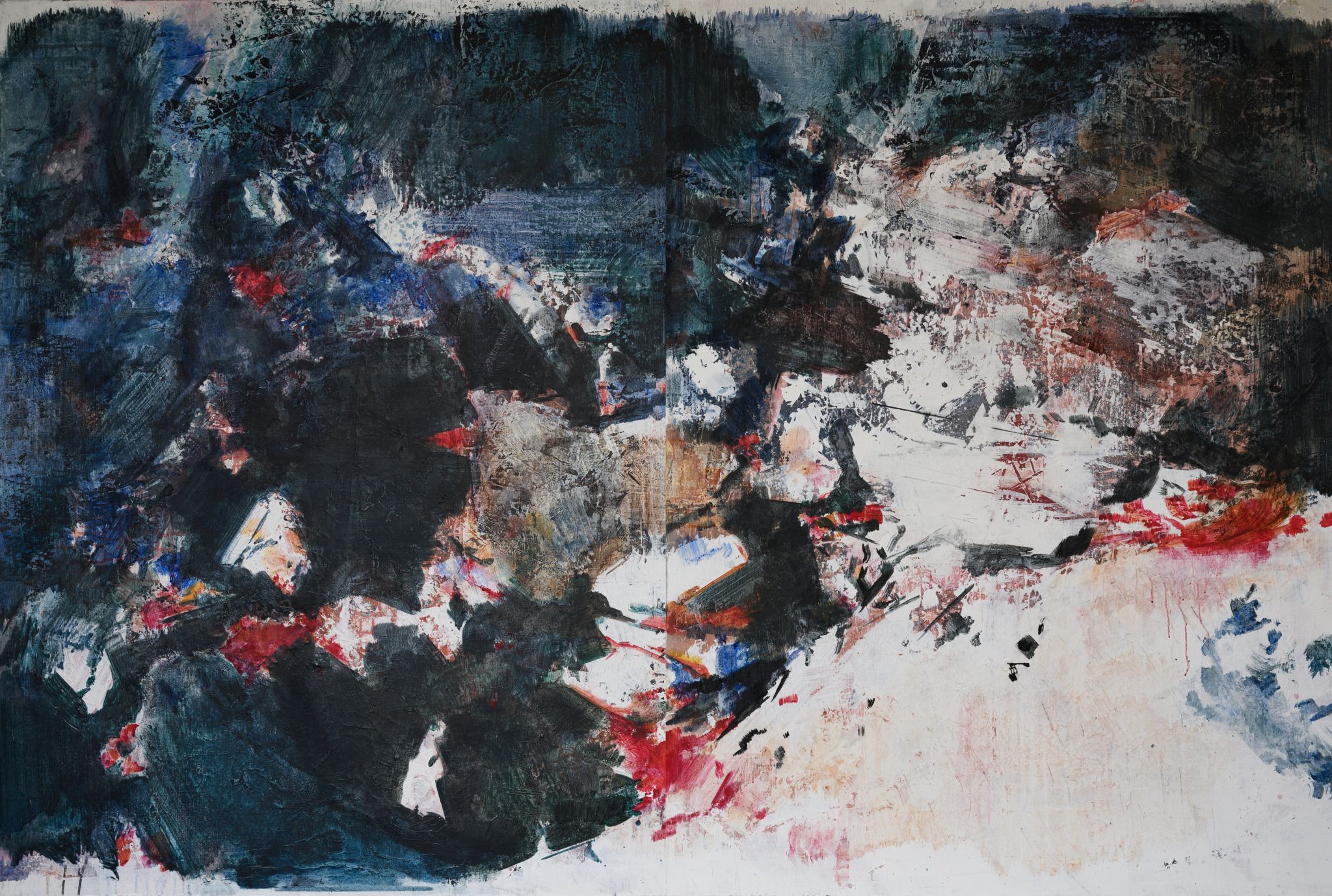 王:绘画活动永远和人的个体相关,人简单它就简单,人复杂它就复杂。所说“画如其人”讲的也是这个意思。从某种意义上说绘画活动也是人的现实存在方式和表现行为。从信仰层面和行为上说,我的绘画活动和状态更像是从现实的“抽离”和“出走”,精神的“持守”和灵魂的“安顿”。走入画室才能真正成为自己。回到自我撑控的世界和感性空间,才能真正回到内心。也许几条线在画面上如何摆放?迹象的质感和味道如何调理?心绪真的能得以舒解和释放。沉浸其间,享受绘画的欢愉,除此之外其它都不存在了,也变得不那么重要了。到了这个年纪,繁华靡丽,过眼皆空。对我来说,绘画活动也是一种救赎,从中寻找生的力量和心的安宁。因此,在这个过程中,我越来越“随心所驭”和“自得其乐”了,绘画更像是满足于一个愿望和一种残存的习惯,成为生活的重要组成部分。生命中最好的存在状态是在画室里孤寂的劳作当中,是远离尘嚣,于林间、溪边、石上流连忘返的那些时刻。当然,选择清流、深渊以及树木、山石作为近期作品中的主要视觉元素,也是试图将儿时终断的记忆续接起来。有人说诗人或艺术家之所以与众不同,是因为他们的童年没有结束,童年的感知力还有很强的持久性。我认同这个说法。每次走进森林,赤脚踏进溪流就如同回到儿时的时光,山光、水色、林幽与鸟鸣会使心灵得到最大的慰藉和修复。我也许自觉或不自觉地借用绘画的方式为自己创建了一个清澈幽远的精神意义上的场所,流连忘返其间,在现实与画面之间虚构出某种隐逸的错觉,寻求一种内在的心里平衡。“苍浪之水清兮可以濯我缨,苍浪之水浊兮可以濯我足”,借此传达现实的感悟、内心的向往和历史的幽思。这是从精神层面上而言。