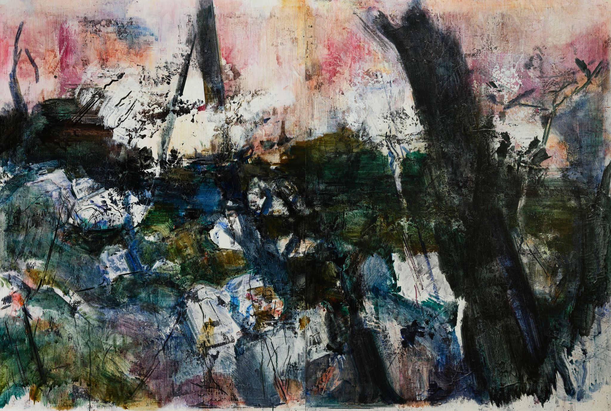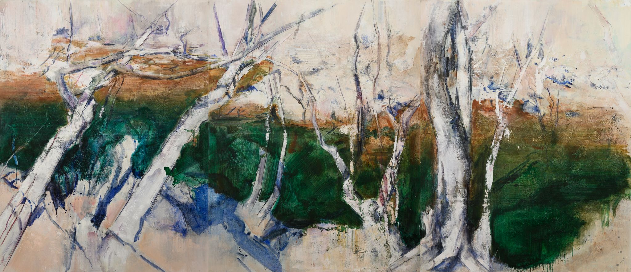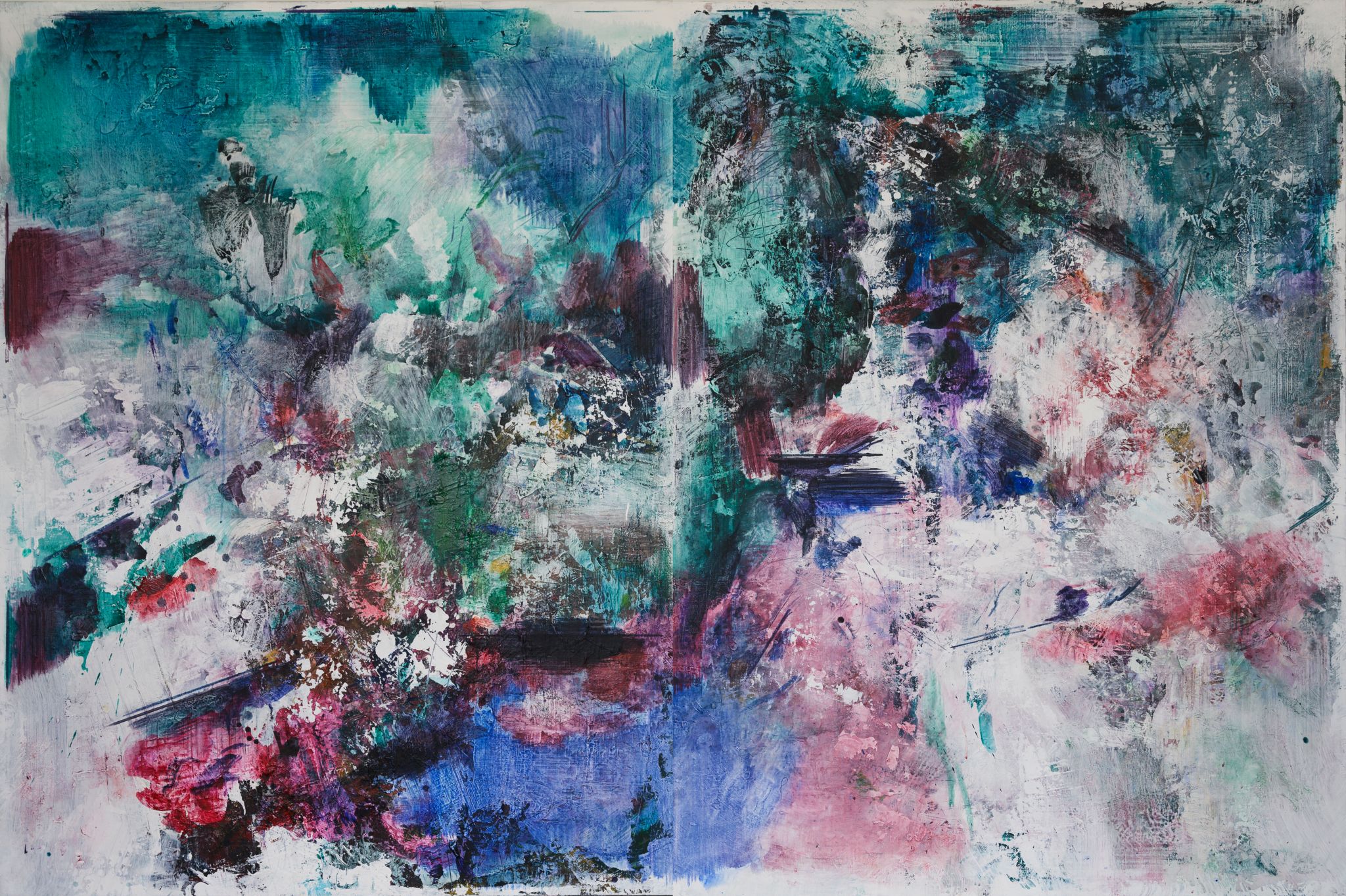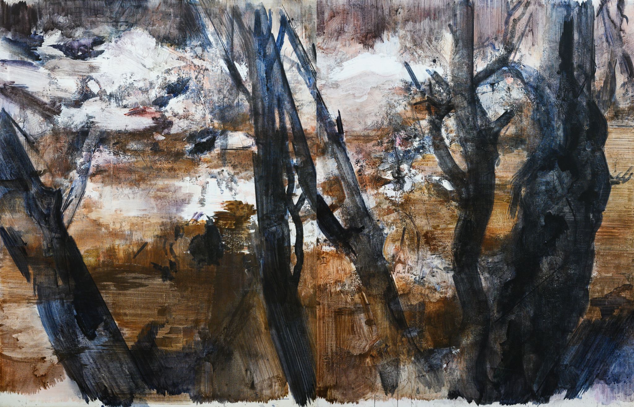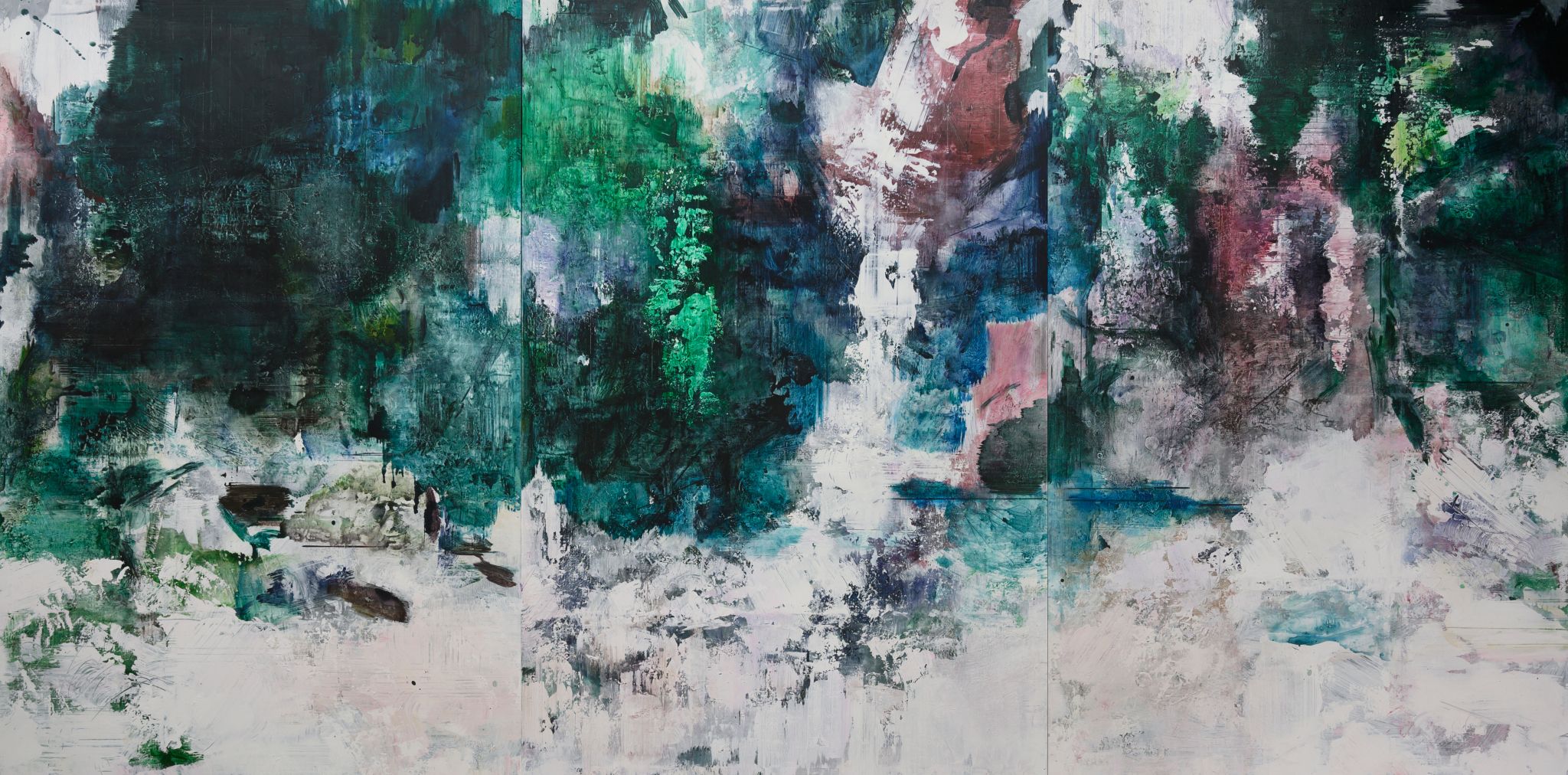 王:绘画活动永远和人的个体相关,人简单它就简单,人复杂它就复杂。所说“画如其人”讲的也是这个意思。从某种意义上说绘画活动也是人的现实存在方式和表现行为。从信仰层面和行为上说,我的绘画活动和状态更像是从现实的“抽离”和“出走”,精神的“持守”和灵魂的“安顿”。走入画室才能真正成为自己。回到自我撑控的世界和感性空间,才能真正回到内心。也许几条线在画面上如何摆放?迹象的质感和味道如何调理?心绪真的能得以舒解和释放。沉浸其间,享受绘画的欢愉,除此之外其它都不存在了,也变得不那么重要了。到了这个年纪,繁华靡丽,过眼皆空。对我来说,绘画活动也是一种救赎,从中寻找生的力量和心的安宁。因此,在这个过程中,我越来越“随心所驭”和“自得其乐”了,绘画更像是满足于一个愿望和一种残存的习惯,成为生活的重要组成部分。生命中最好的存在状态是在画室里孤寂的劳作当中,是远离尘嚣,于林间、溪边、石上流连忘返的那些时刻。当然,选择清流、深渊以及树木、山石作为近期作品中的主要视觉元素,也是试图将儿时终断的记忆续接起来。有人说诗人或艺术家之所以与众不同,是因为他们的童年没有结束,童年的感知力还有很强的持久性。我认同这个说法。每次走进森林,赤脚踏进溪流就如同回到儿时的时光,山光、水色、林幽与鸟鸣会使心灵得到最大的慰藉和修复。我也许自觉或不自觉地借用绘画的方式为自己创建了一个清澈幽远的精神意义上的场所,流连忘返其间,在现实与画面之间虚构出某种隐逸的错觉,寻求一种内在的心里平衡。“苍浪之水清兮可以濯我缨,苍浪之水浊兮可以濯我足”,借此传达现实的感悟、内心的向往和历史的幽思。这是从精神层面上而言。
