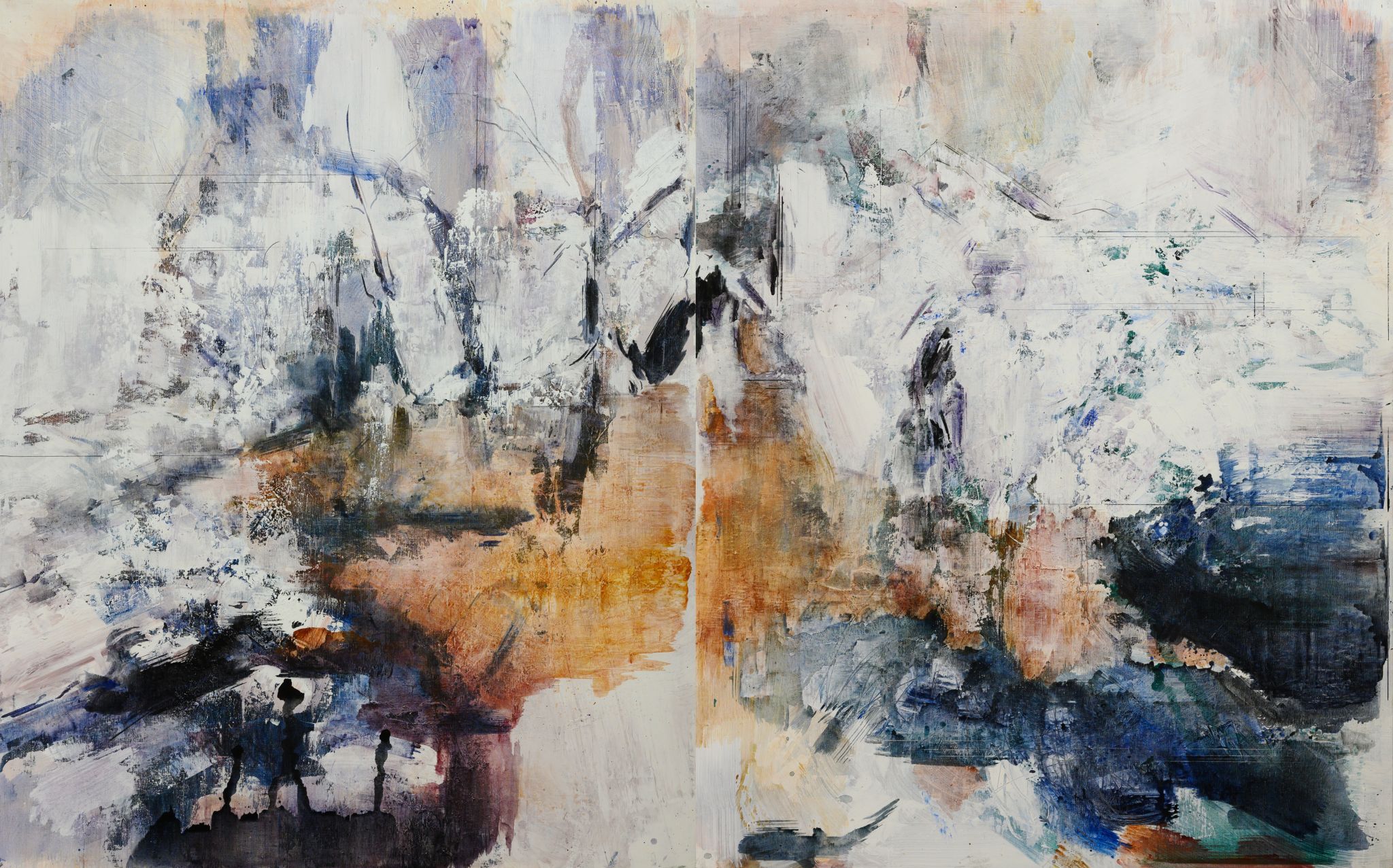 王:从绘画“物性”这个角度讲,中国传统书画以宣纸、笔墨为主要媒介,绘画中的意象,书法中的线条形势与笔墨趣味是相互依存的。我认为讲究笔墨趣味和强调书写性是其核心的东西。正是因为有了这个“虚间”和“虚性”,才使得中国传统绘画与西方绘画有着完全不同的抽象性和视觉性,所谓“气韵生动”,是由立象达意时书写的行为状态与相生的“墨迹”中呈现出来,使“物性”和“心性”达至完美的契合。讲的是抽象的表现性。与西方传统绘画涂抹覆盖不同,中国画的留白是获取绘画迹象和视效的重要手段和方式。我在短暂的书法研习过程中对毛笔的书写性,水墨与宣纸之间浸染相生的氤氲迹象在绘画中的意义颇有心得,对我近期的绘画创作可能有一些影响。最新较大的几张长条形图式作品的确采用了中国传统画家”游目”的观看方法和手卷的构成方式。