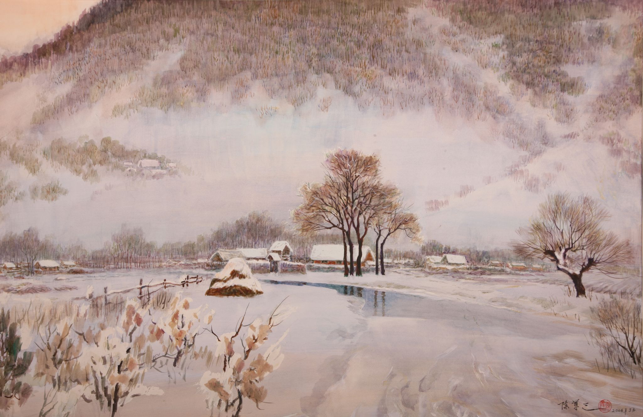 陈尊三在艺术思想上深受鲁艺传统的影响,重视生活体验和观察,努力在作品中探索具有中国特色的艺术语言,并把质朴当作追求的最高境界。代表作石版画《元茂屯公审大会》编入《中国现代美术全集版画卷》;木刻《祝福》、石版画《颓败线的颤动》等除在国内展出外,还在日本展出。陈尊三除版画创作外,还从事水彩画创作。他很重视每次作画时的独特感受,即“情”的抒发和“境”的营造。1992年应邀去俄罗斯圣彼得堡﹒列宾美术学院讲学,讲述中国水印木版画。1996年中国版画家协会授予他“鲁迅版画奖”,以表彰他在五、六十年代在版画事业上作出的贡献。1999年俄罗斯政府授予他“普希金文化勋章”,并由列宾美术学院聘为该院荣誉教授。