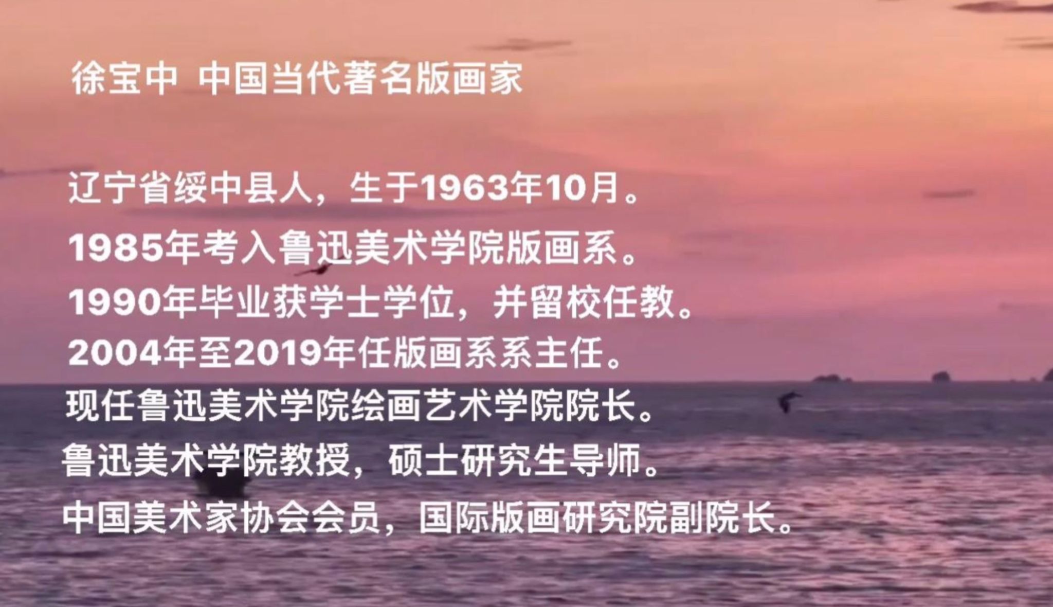 徐宝中,中国当代著名版画家。辽宁省绥中县人,生于1963年10月。1985年考入鲁迅美术学院版画系。1990年毕业获学士学位,并留校任教。2004年至2019年任版画系系主任。现任鲁迅美术学院绘画艺术学院院长。鲁迅美术学院教授,硕士研究生导师。中国美术家协会会员,国际版画研究院副院长。