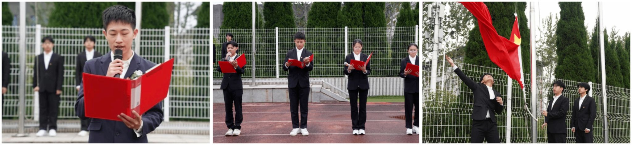在庄严的国歌声中,鲜艳的五星红旗在全场师生的注视下冉冉升起,迎风飘扬。全体师生肃立致敬,高唱国歌,表达对伟大祖国的无限热爱与对历史的深切缅怀。