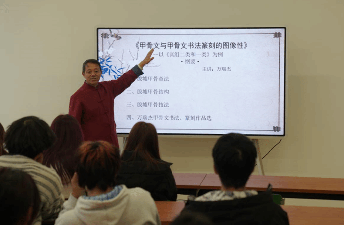 开幕式后,万瑞杰社长为人文学院(大连)师生举行专题学术讲座《甲骨文与甲骨文书法篆刻的图像性》,从章法、结构、技法三个维度深入解析甲骨文的艺术密码。
