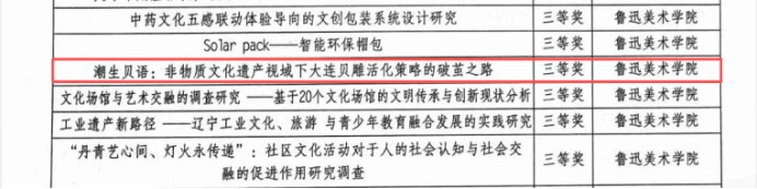 由共青团辽宁省委员会、辽宁省教育厅等七家单位联合主办的第十七届“挑战杯”辽宁省大学生课外学术科技作品竞赛圆满落幕,本届竞赛共收到省内95所学校的共计1854件参赛作品。在王雄教授、谢伟光教授、都晓平老师联合指导下,我院巩孝天、党贝贝同学的《潮生贝语:非物质文化遗产视域下大连贝雕的破茧之路》获得了“辽宁省赛三等奖”的好成绩。