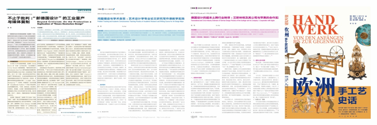 累计在《装饰》《山东工艺美术学院学报》《艺术与设计(理论)》《工业工程设计》等期刊发表学术论文20余篇。代表论文包括:《德国设计:一段有建设性的问题史》(《装饰》,2017年第6期)、《德国设计历史与设计理论》(《装饰》,2017年第6期)、《并非任其自然的想法:设计教学法中的艺术直觉》(《装饰》,2017年第6期)、《现代设计思想内核与技术外壳在第三帝国的断裂与延续》(《装饰》,2018年第9期)、《被计划的功能:民主德国现代设计的功能主义路线》(《装饰》,2021年第2期)、《不止于批判:“新德国设计”的工业量产与媒体复制》(《装饰》,2022年第10期)、《问题循迹与学术自觉:艺术设计学专业论文研究写作课教学实践》(《装饰》,2023年第12期)、《德国设计的超本土跨行业转译:艾斯林格及其公司与苹果的合作实践》(《装饰》,2024年第9期)等。