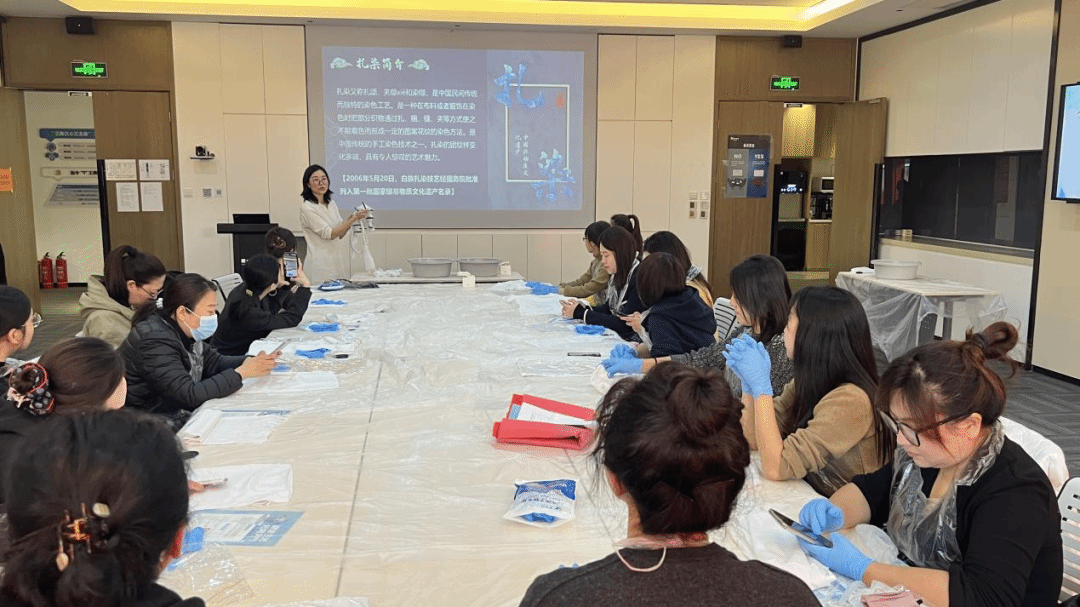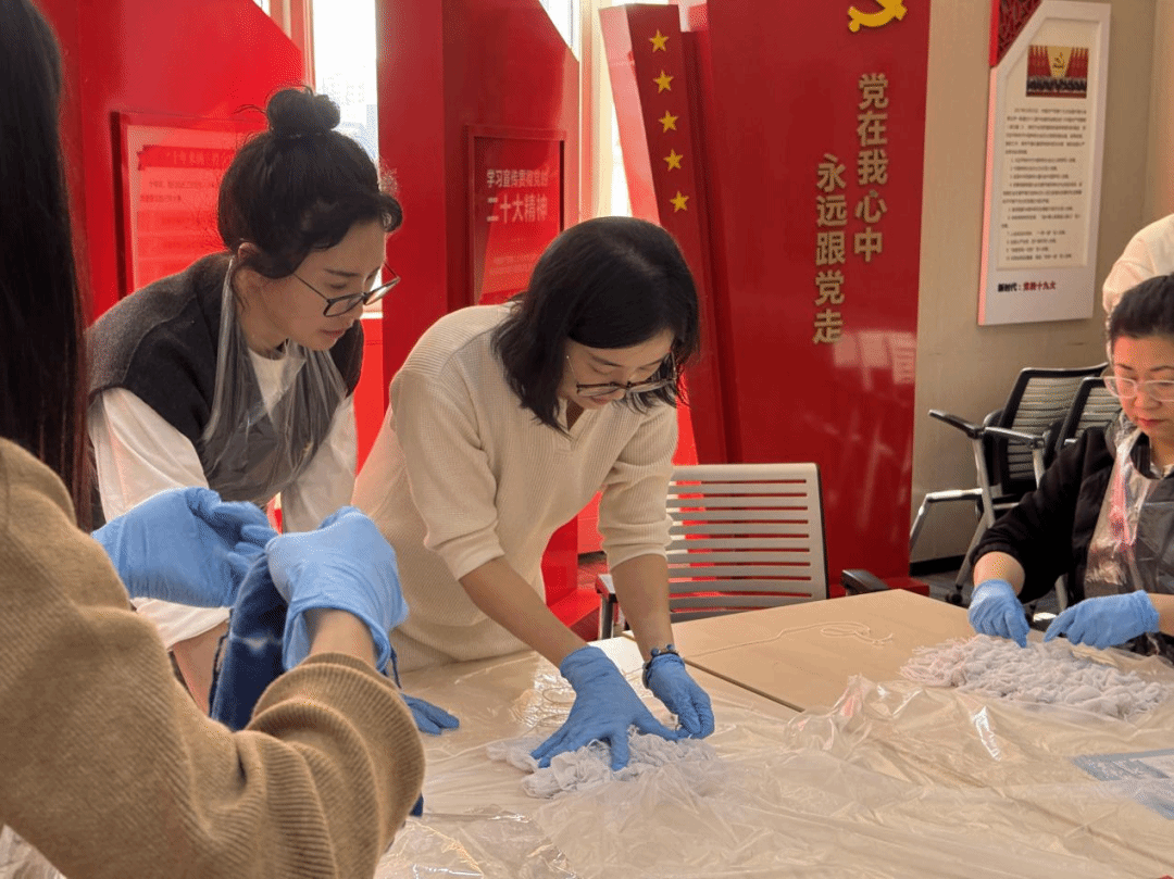 近日,染织服装艺术设计学院(大连)直属党支部在沈阳万象楼宇文化中心组织开展了“吉祥丝巾艺术进社区——传统非遗扎染文化实践活动”。本次活动由支部统战委员陈雪同志主持,吸引了楼宇企业职工广泛参与,并特别邀请在本地进行文化交流的外国友人代表团共同体验,以扎染非遗文化为纽带,生动实践了“党建+文化传承+社会服务”的融合模式。