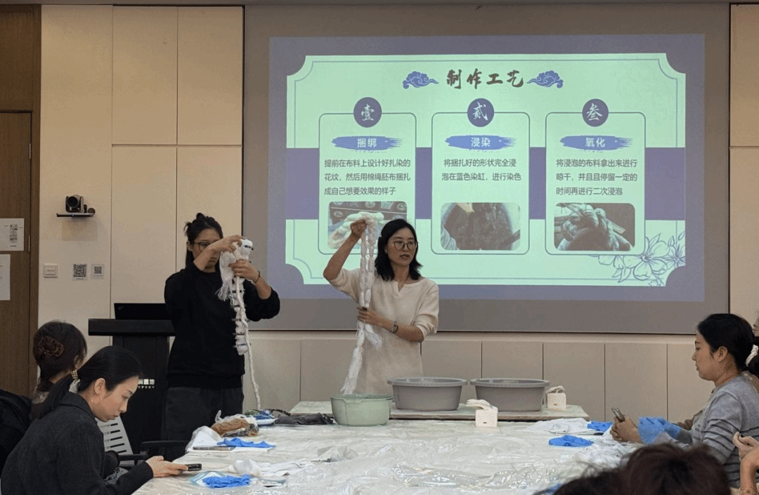 活动中,陈雪老师通过丰富的历史图片与实物样本,深入浅出地介绍了扎染技艺的千年渊源与其作为纺织印染史“活化石”的文化价值。她指出,扎染不仅是一门手艺,更体现了东方哲学中“天人合一”的思想理念,每一件作品都是人与自然的共创。师生党员发挥专业优势,将非遗知识带进社区,让参与者在动手实践中感受中华优秀传统文化的魅力。