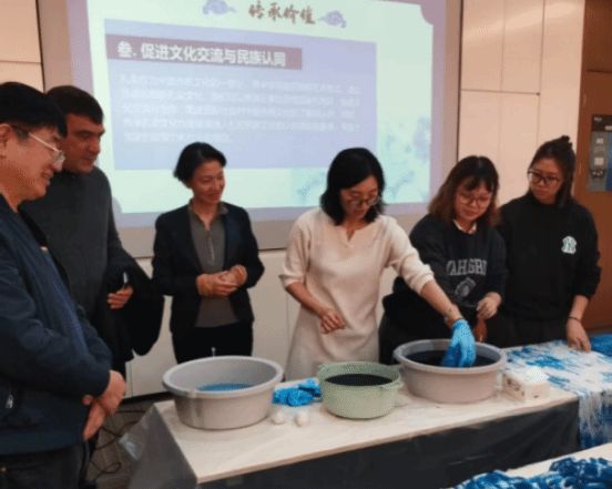 活动设置了完整的丝巾扎染体验环节。在师生党员的引导下,中外参与者共同观摩并体验了从浸染、氧化、清洗到拆线的扎染全流程,沉浸式领略传统工艺所蕴含的匠心与智慧。现场气氛热烈,互动频繁,非遗文化成为连接社区群众与外国友人的情感桥梁。