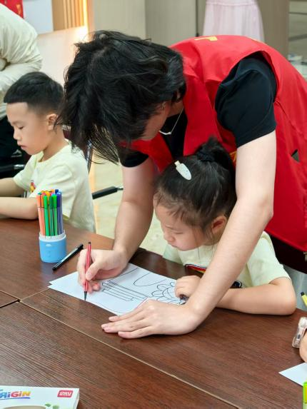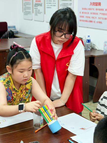 在东港市港北社区,志愿者们以“青春力量,点亮社区温度”为主题开设美育课堂,与社区儿童展开温暖互动。课堂上,孩子们以“在国旗下成长”为主题进行创作,志愿者们俯身指导。有的孩子画下军装和五星红旗,有的孩子画出未来的太空梦。一张张稚嫩的画纸上,是他们心中最朴素的爱国情,也是对未来最真挚的想象。