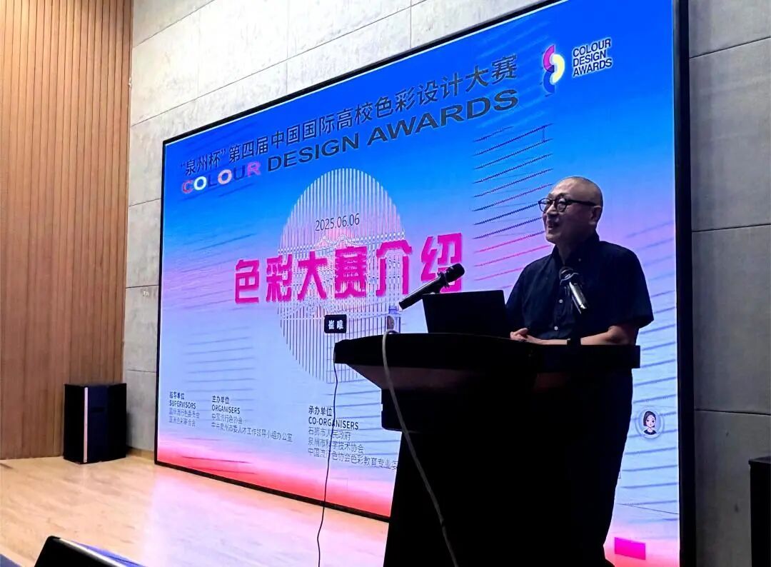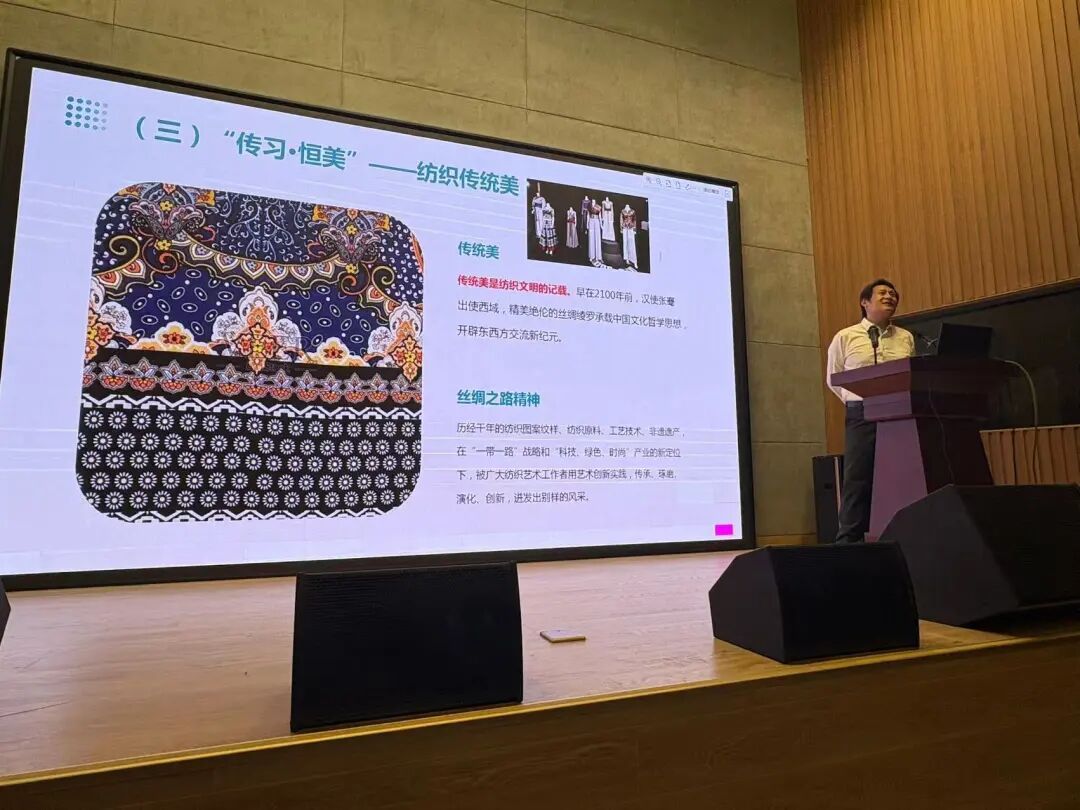 中国流行色协会教育委员会主任、北京服装学院教授、中国国际高校色彩设计大赛组委会和评审会主任崔唯则带来《彩引艺新:流行色引领的纺织品设计艺术创新研》专题报告。崔教授以国际视野解析色彩趋势与设计创新的联动机制,通过大量案例展示色彩如何驱动产品价值提升,并特别指出学院师生作品在色彩应用上的敏锐性与艺术性已具备行业示范意义。讲座同期,崔唯教授面向全院师生权威解读“第四届中国国际高校色彩设计大赛”章程,鼓励师生以色彩为媒介,展现创新思维。