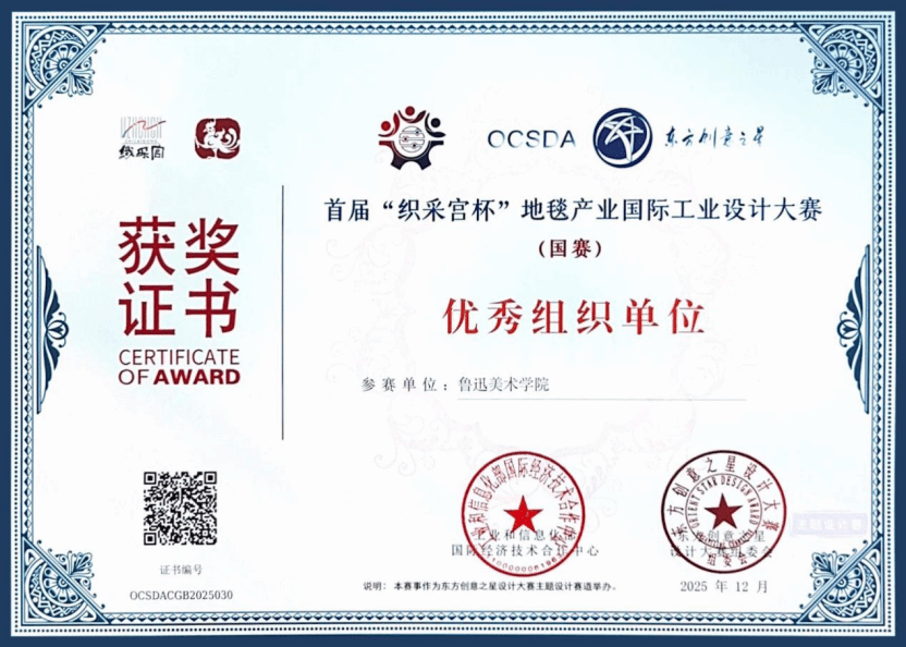 我院师生在本届赛事中成绩斐然。经过省赛的选拔以及国赛的多轮评审,在“织采宫杯”地毯产业国际工业设计主题赛道中,我院师生累计斩获27个奖项。其中全国金奖1项、银奖2项、铜奖2项,省级金奖8项、银奖6项、铜奖8项。此外,因组织工作成效突出为学校赢得“优秀组织单位”,陈雪老师获评“优秀指导教师”。同期,我院教师在教学创新大赛中也实现突破,获省级金奖1项、全国铜奖1项。上述成绩充分体现了我院在染织与软装设计专业领域的教学水平、人才培养质量和创新实践能力。