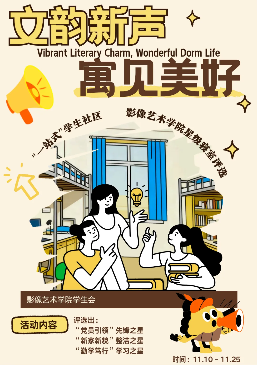 为深入推进鲁迅美术学院“一站式”学生社区建设,充分发挥学生社区在育人工作中的重要作用,激发学生的集体荣誉感和自我管理能力,全面促进我院学风建设,营造积极向上、整洁有序、勤学笃行的社区氛围,影像艺术学院开展“一站式”学生社区建设系列活动。