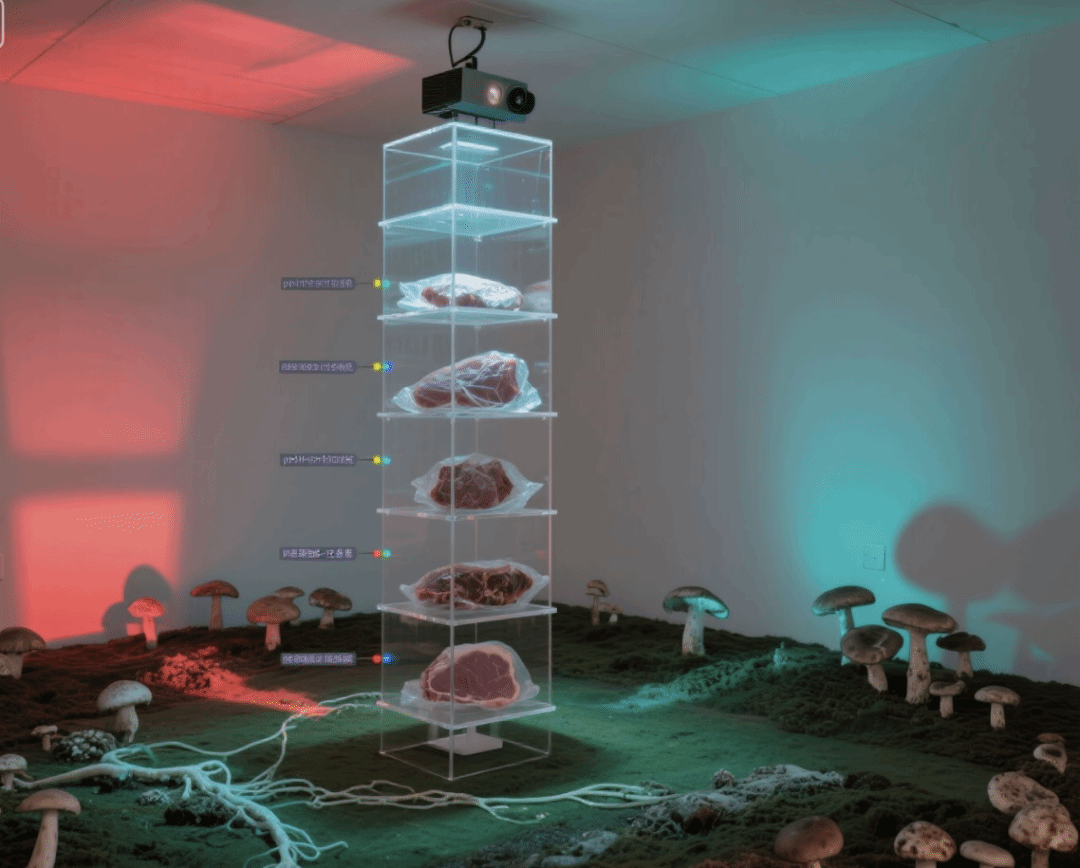 底部培养食用菌(如平菇),以腐败肉类为营养基,菌丝体生长路径与投影光影交互。