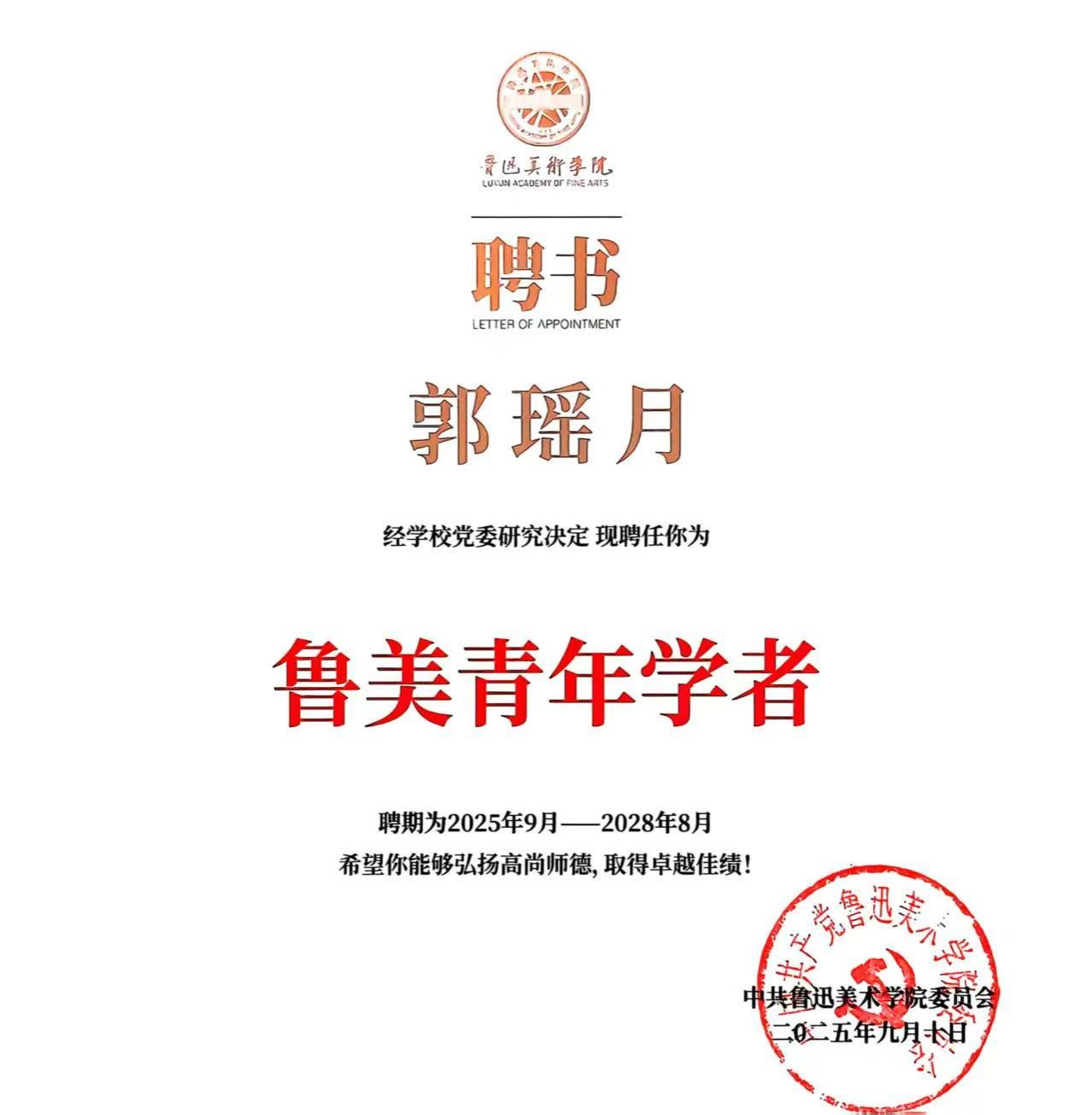 为贯彻落实中央人才工作会议精神,深入实施人才强校战略,建立持续、稳定的人才发展支持体系,强化青年骨干人才在学科专业建设及科研工作中的重要作用,学校党委研究出台了《鲁迅美术学院“鲁美青年学者(艺术家)人才支持计划实施办法(试行)》政策,遴选了首批18名青年教师,马克思主义学院教师郭瑶月凭借突出的学术成果与科研潜质入选鲁迅美术学院首批“鲁美青年学者”人才培养计划。