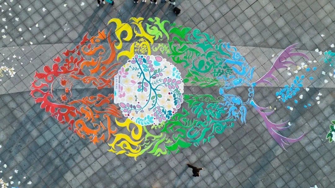 这幅命名为《春槐海韵·鹿影传情》的巨型地画作品,长20米,宽10米,创作团队立足本土文化基因,巧妙融合传统纹样与现代视觉语言:主体造型采用灵动回眸的梅花鹿与憨态可掬的斑海豹这对大连"城市精灵",以环形祥云纹样托举平面化处理的槐花造型;彩虹七色为基调的渐变色系,既延续传统色谱的典雅,又注入青春活力的时尚气息;严谨的对称式构图彰显庆典仪式的庄重感,而中心区域平面设计版槐花元素的穿插,则平添几分童趣盎然的艺术巧思。