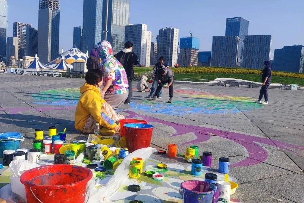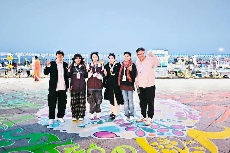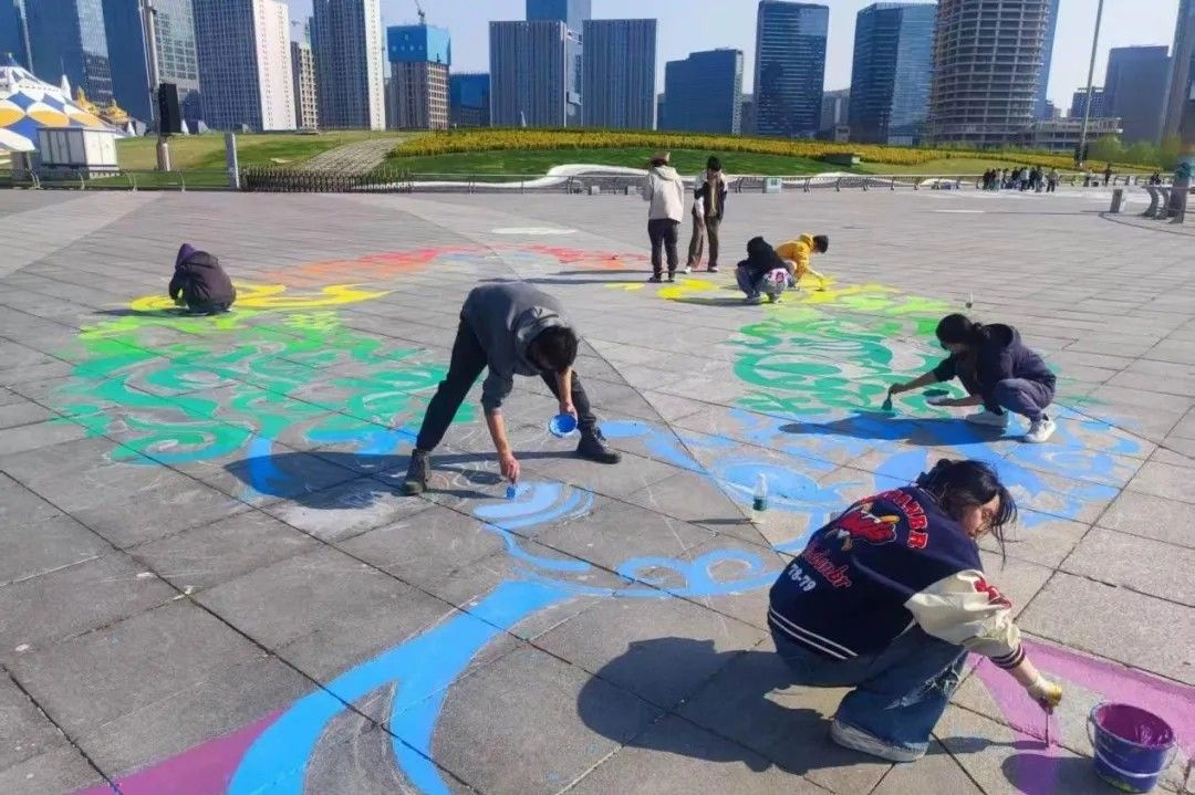 在创作实践中,师生团队重拾传统手绘技艺的温度,从丙烯颜料特性研究到地面肌理处理,从整体色彩规划到细部纹样刻画,师生们顶着海边多变的气候条件,积极配合主办方的日程安排,将工期压缩到2天,日均躬耕8小时,完成现场绘制。项目负责人传媒动画学院副院长张晓辉介绍:"这种大型协作式创作既是技艺的淬炼,更是美育的实践课堂。同学们不仅需要精准把控200:1的尺度转换,更能培养对大型作品的整体掌控力和团队协作能力,在创作实践中感受中国传统美学浸润的同时,也是对同学们意志力的挑战和锻炼。"