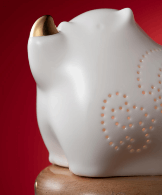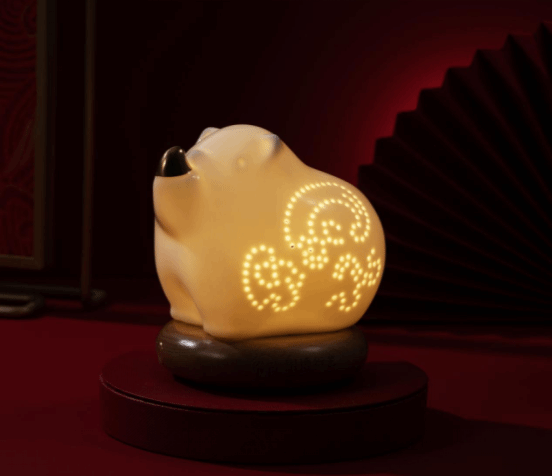 中国国家博物馆珍藏的错金银云纹青铜犀尊,是汉代青铜艺术的瑰宝。其通体错金银云纹如星河璀璨,犀牛昂首挺立的姿态彰显雄浑气魄,既是古代工艺的集大成者,亦承载着中华文明对自然的敬畏与对祥瑞的向往。如何让这一文物突破展柜的局限,走进大众生活?设计团队以“萌化”为切入点,将犀牛尊的威严身形转化为圆润柔和的轮廓,保留标志性云纹的韵律感,同时融入现代极简美学,最终打造出“犀犀向荣”小夜灯。设计师表示:“我们希望通过柔和的线条与暖光设计,让文物从历史的‘旁观者’变为生活的‘参与者’。”