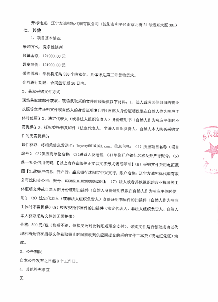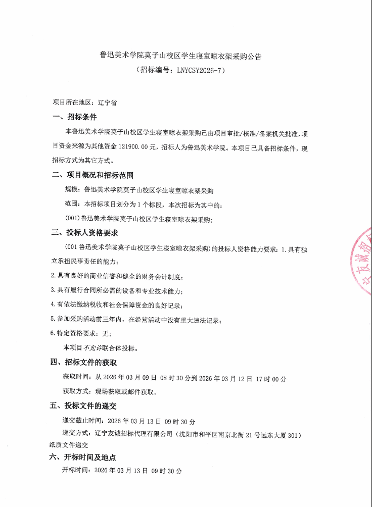 鲁迅美术学院莫子山校区学生寝室晾衣架采购公告