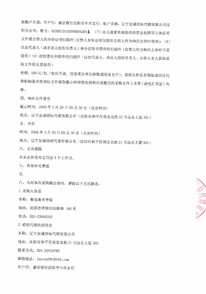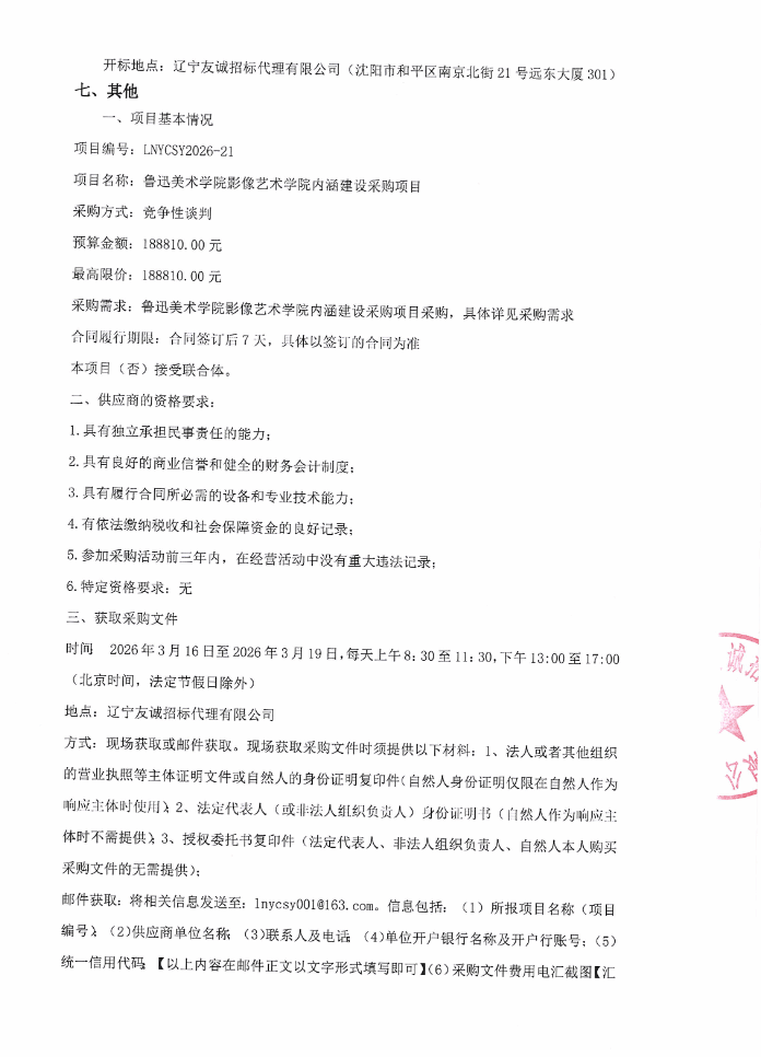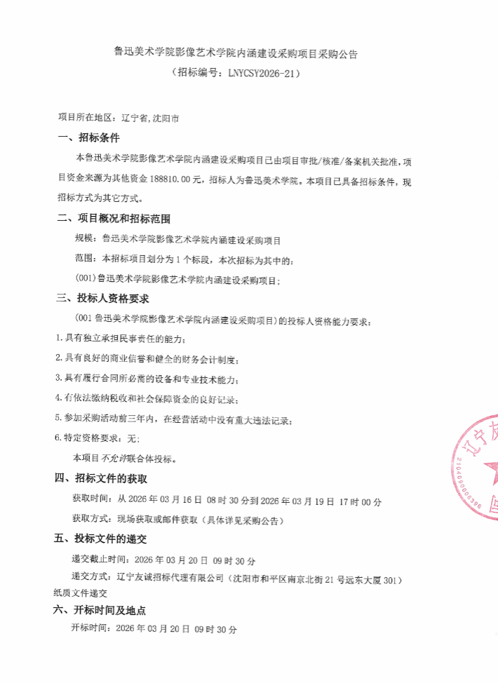 鲁迅美术学院影像艺术学院内涵建设采购项目采购公告