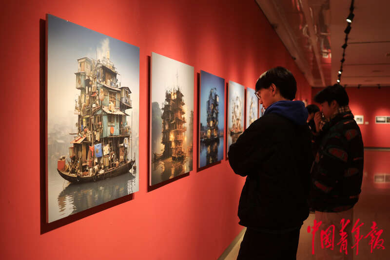 12月9日,辽宁沈阳,鲁迅美术学院美术馆,第11届学院优秀摄影作品展上,几名学生在观看一组用AI技术制作的摄影作品。无论是亦真亦幻的超现实场景、用AI扩图功能为经典摄影作品“添砖加瓦”,还是与AI仿制的奥本海默博士“对话”,此次展览中有不少作品都运用到了AI技术,也展现出当今年轻人对AI技术的思考。据策展人严程介绍,此次展览的主题“悬置与显现”体现了近年来人工智能快速发展带来观看的不确定性,以及我们如何在这种背景下重塑影像创作的主体性,探索蕴含在现实世界背后的真相。中青报·中青网记者 孔斯琪/摄