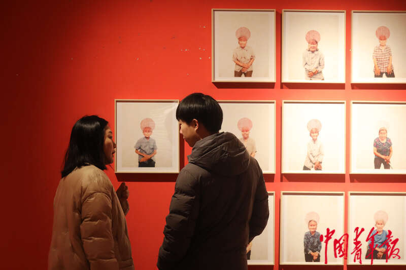 12月9日,辽宁沈阳,鲁迅美术学院美术馆,第11届学院优秀摄影作品展上,两名学生从四川美术学院学生曾凯敏的作品前走过。这组作品试图用影像探讨当今社会人们的审美、身份认同和生活方式趋于模式化的问题。中青报·中青网记者 孔斯琪/摄
